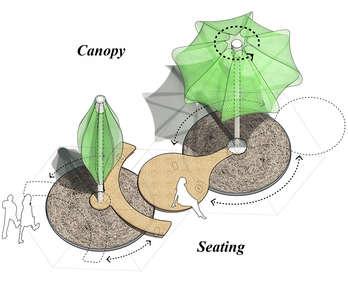 도는 것은 하나 더 있다. 원심목에는 각각 사람들이 앉을 수 있는 동그란 형태의 벤치를 갖고 있는데, 이러한 벤치들에는 바퀴가 달려 원심목 주위를 빙빙 돌 수가 있다. 모터의 회전 속도에 따라 그 모습이 변하는 원심목들처럼 사람들이 어떻게 쓰느냐에 따라 전체적인 원심림의 모양이 변한다. 벤치들은 때로 가까이 붙어 있기도 하고, 멀리 떨어지기도 한다. 필요할 때에는 그림자가 생기는 방향으로 벤치가 따라가야 한다.