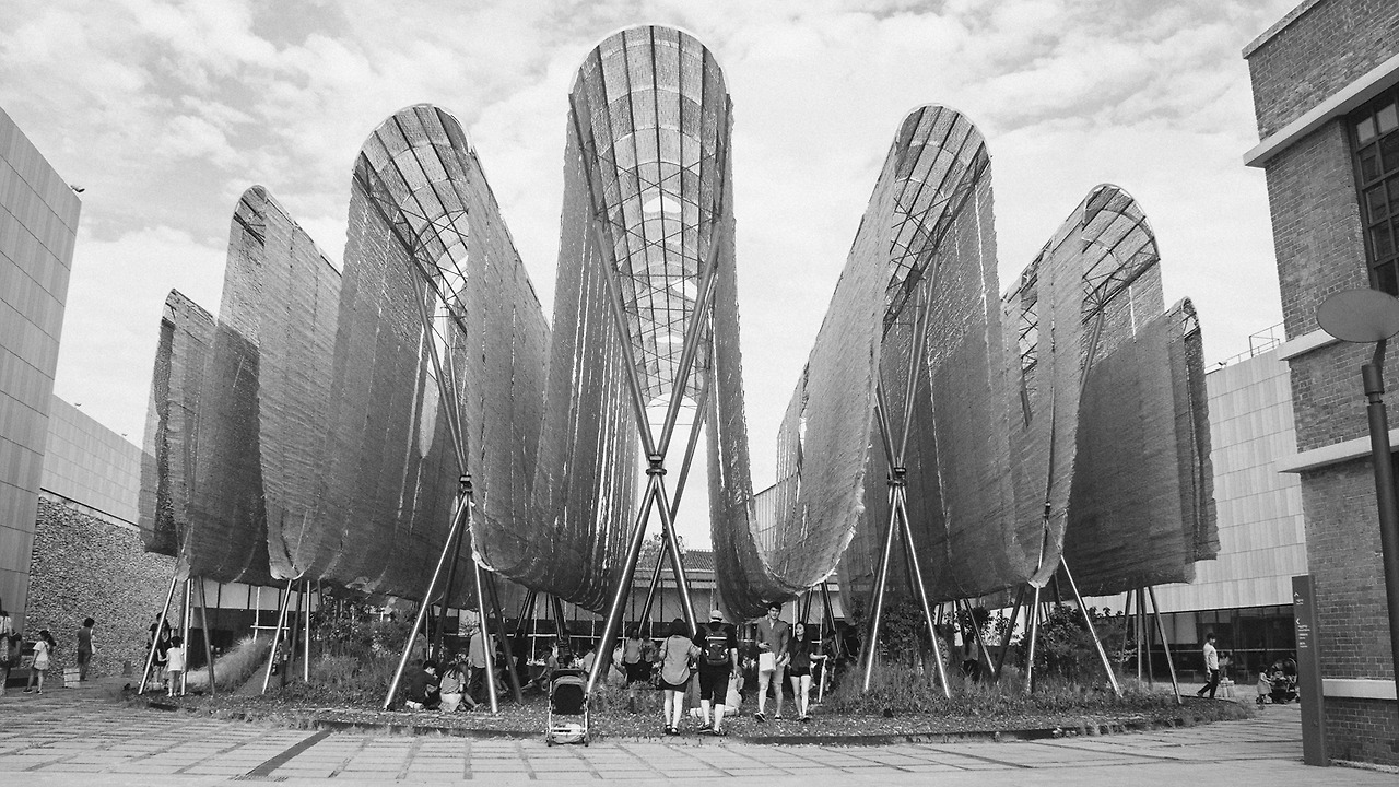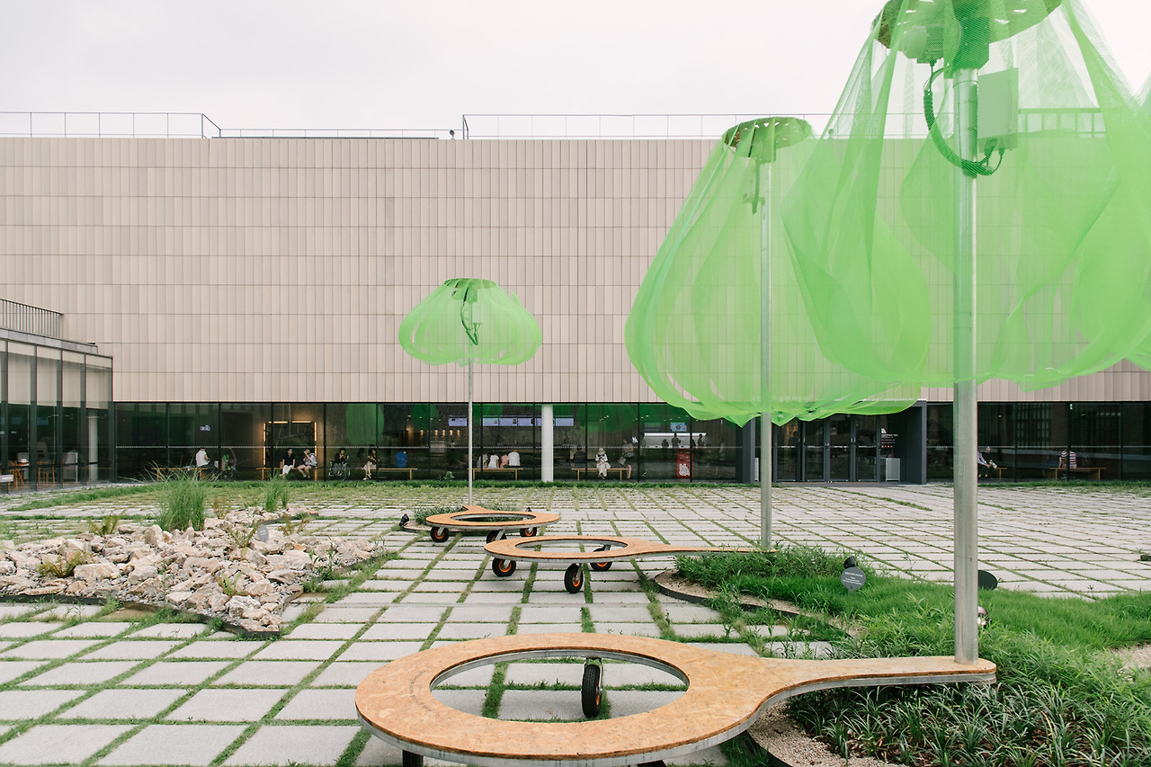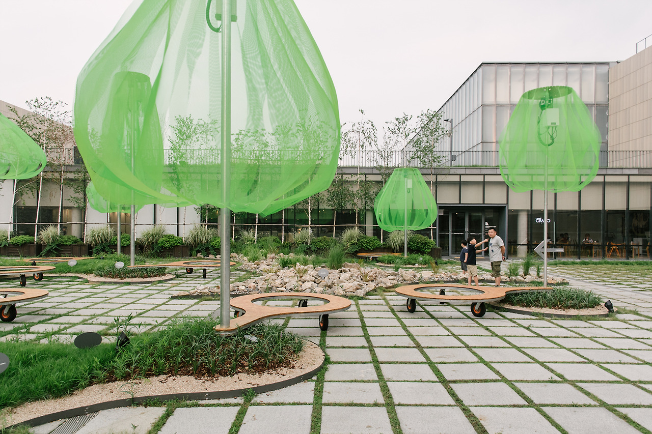 그늘을 만들어야 했다. 사각형의 넓은 야외 공간에서 사람들이 쉬어야 했으니까. 그러려면 통상적으로 사람 키보다 높은 곳에 해를 막을 수 있는 무언가가 넓게 펼쳐져야 한다. 무언가를 넓게 펼치기 위해서는 떠 있을 수 없을 테니 그를 받치는 구조가 필요한데, 구조가 생겨 넓은 무언가를 잡고 있기 시작하는 순간 또 다른 문제가 발발한다. 바람이 불면 하늘에 연을 띄우는 것과 같은 원리로 그늘을 만들고 있는 모든 것이 날아간다.