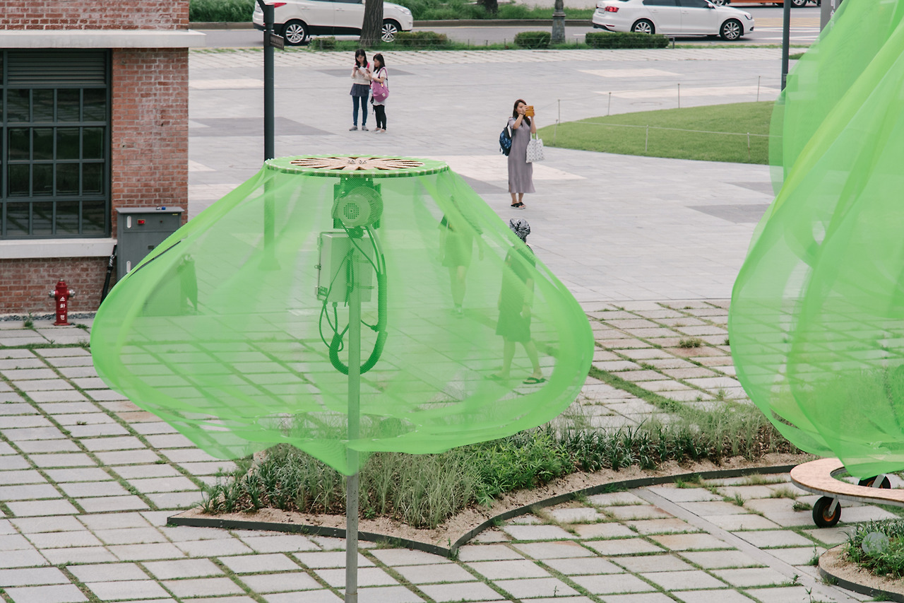 크게 부푼 플라스틱 망은 햇빛을 막아 그늘을 드리운다. 하나하나가 거대한 그늘을 만들지는 못해도, 여러 개가 모여 전체적인 그늘 하나를 바닥에 수놓는다.