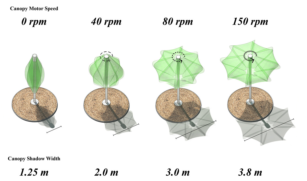 센서로 바람의 세기를 감지한다. 바람이 불지 않으면, 나무 위에 달린 모터는 돌기 시작한다. 플라스틱 망은 모터가 세게 돌면 돌수록 넓게 퍼진다. 밖으로 향하려는 원심력 때문이다. 원심력을 이용한 장치이기 때문에 건축가는 이 인공의 나무 한 그루에 원심목이라는 이름을 붙여 주었다.