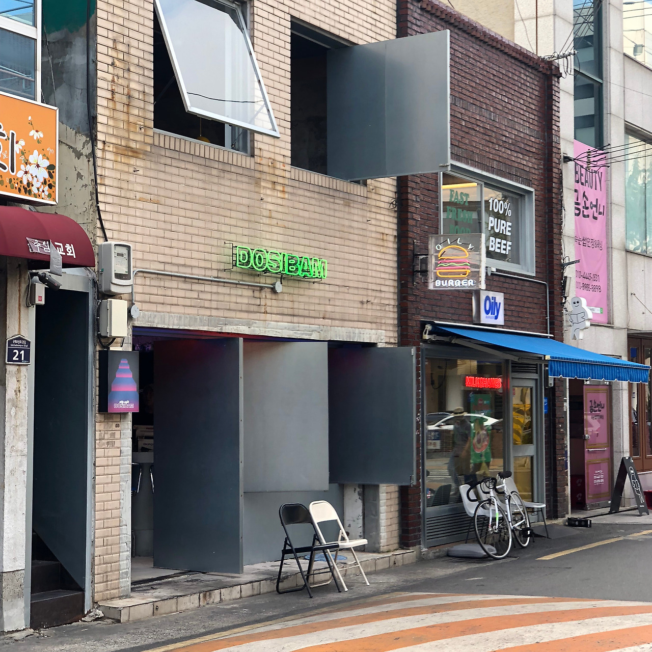 하지만 그것이 상업시설이라면 조금 이야기가 달라진다. 때로는 바깥의 풍경을 막고 내부에 더 집중해야 할 때가 있다. 특히 낮에는 문을 열지 않는 곳, 그러니까 술집이라면 채광을 위한 창은 필요하지 않을지도 모른다. 그래서 도시밤은 아주 솔직한 방식의 창과 문을 택했다. 열릴 땐 열리고, 닫힐 땐 닫히는 창과 문이다. 극단적이지만 정직하다.