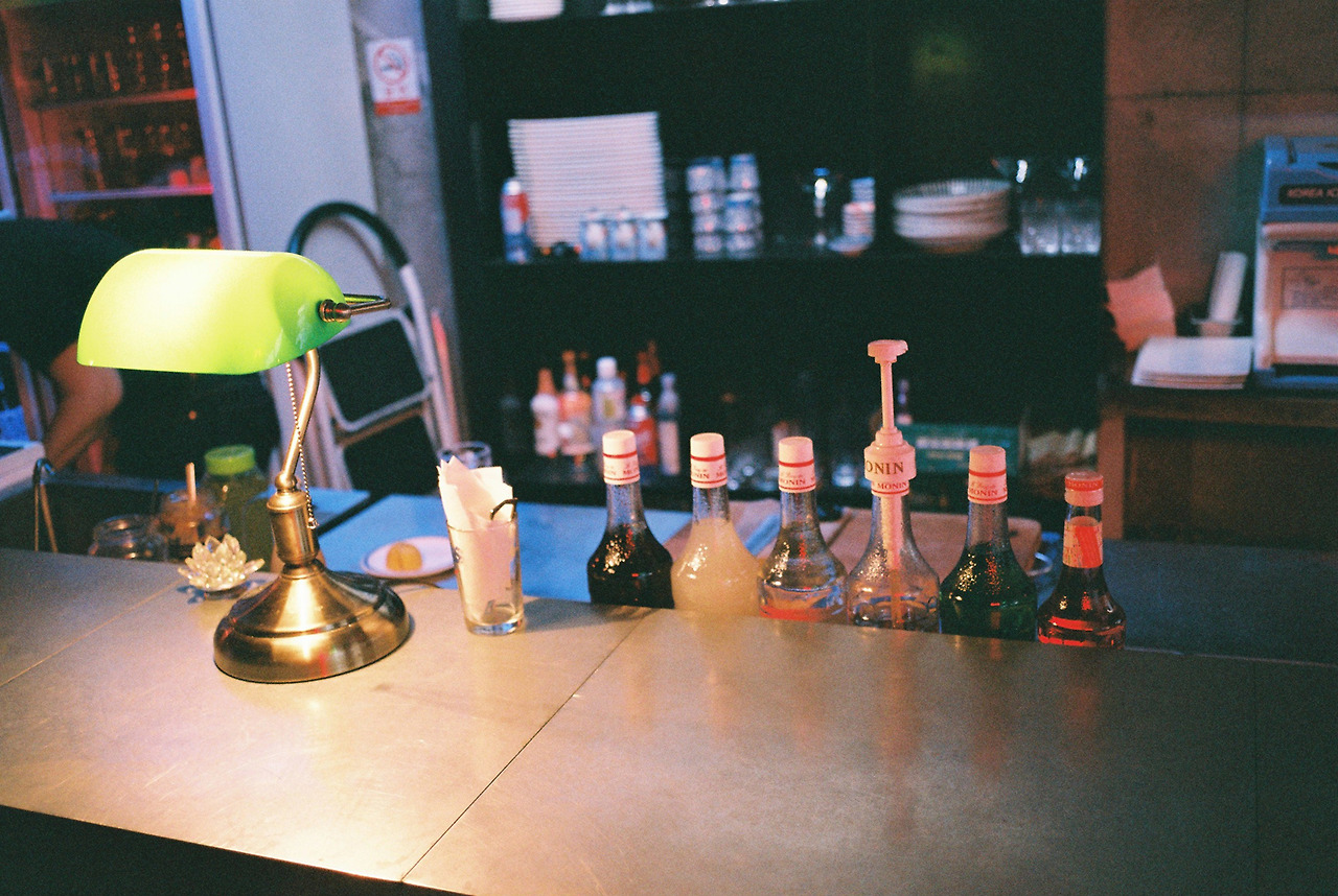입구에서부터 바는 시작된다. 그리 넓지 않은 공간이라 바가 길게 들어가고 나니, 공간이 모두 찼다. 입구에 걸린 네온사인의 현란한 색이 바로 그대로 투영된다. 빛의 색을 최대한 살리기 위해서인지 가구들은 모두 거친 무채색의 금속 재료들을 가져다 사용했다. 금속은 얇고 날카로우며 차갑지만, 빛을 많이 품는다.