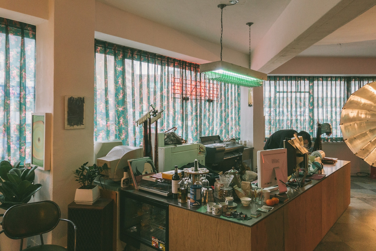 망우삼림을 단순한 현상소라 정의 내리긴 어렵다. 망우삼림은 현상소이기도 하지만, 포토스튜디오이기도 하고 카페도 함께 겸한다. 각 역할을 수행하기 위한 공간은 철저히 분리되어 있는데, 구획되지 않은 사무실 속에서 한 켠에는 조명과 흰 배경 천이 드리워 있고, 창을 뒤로한 중앙에는 필름 현상 기계와 함께 작게 음료를 준비하는 공간이 마련되어 있다.