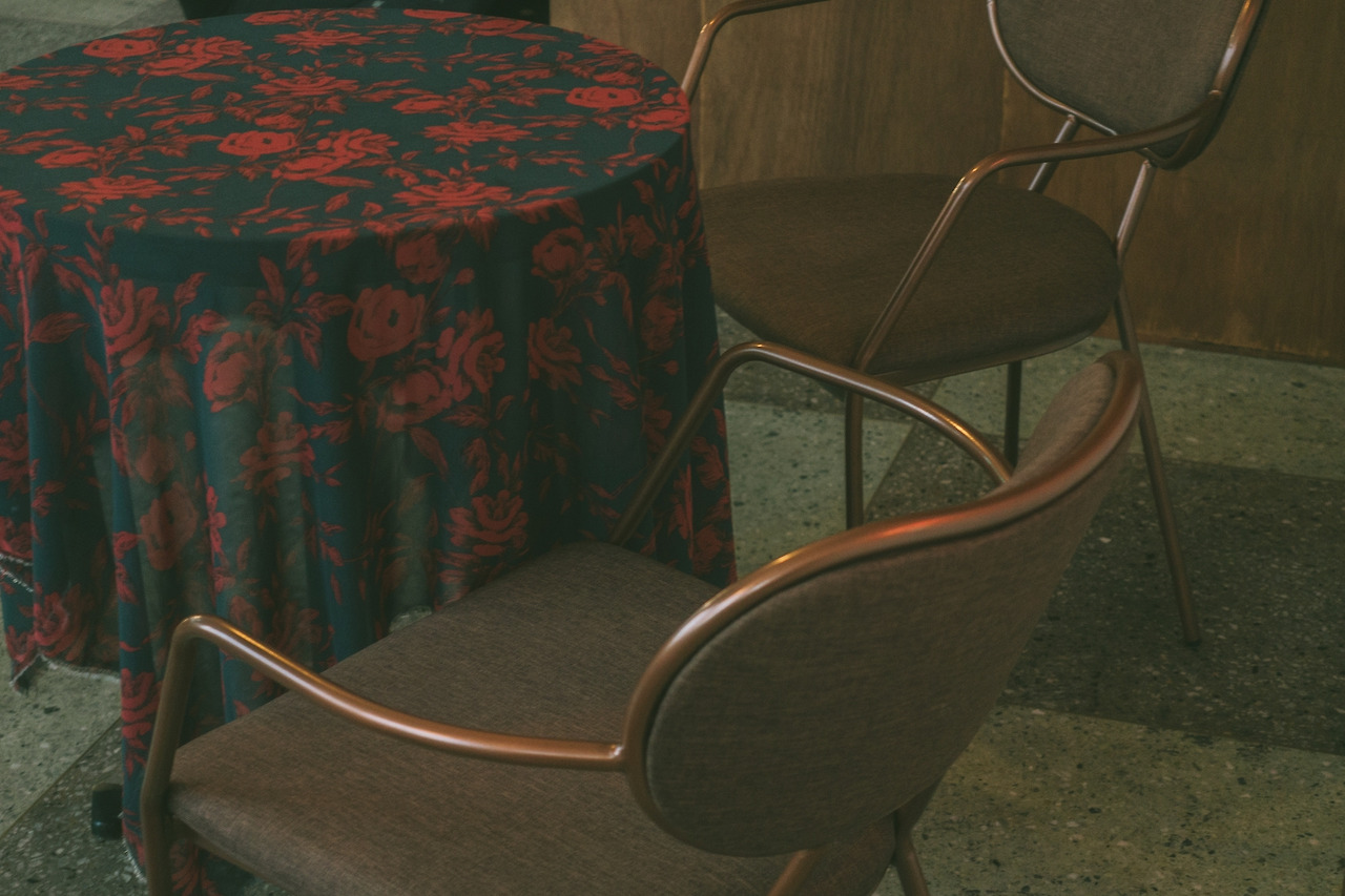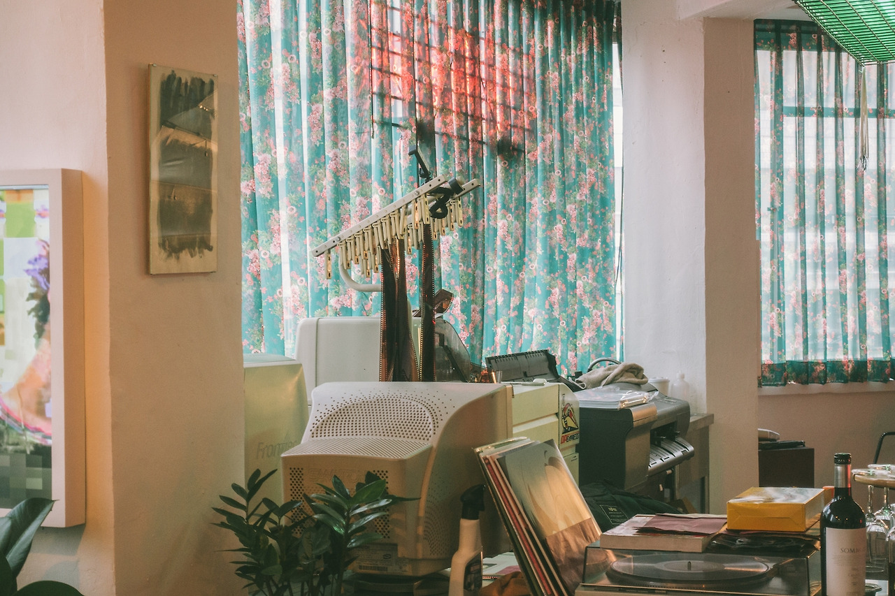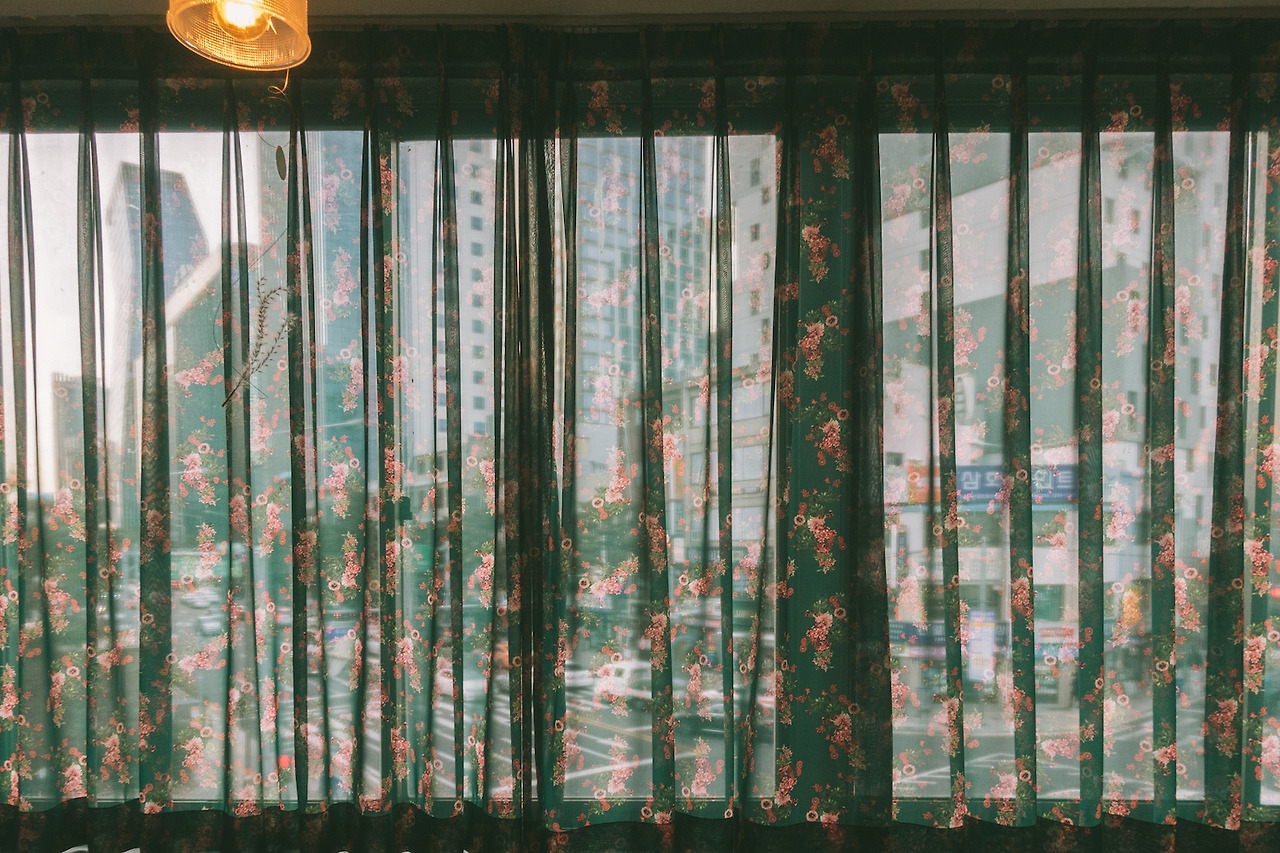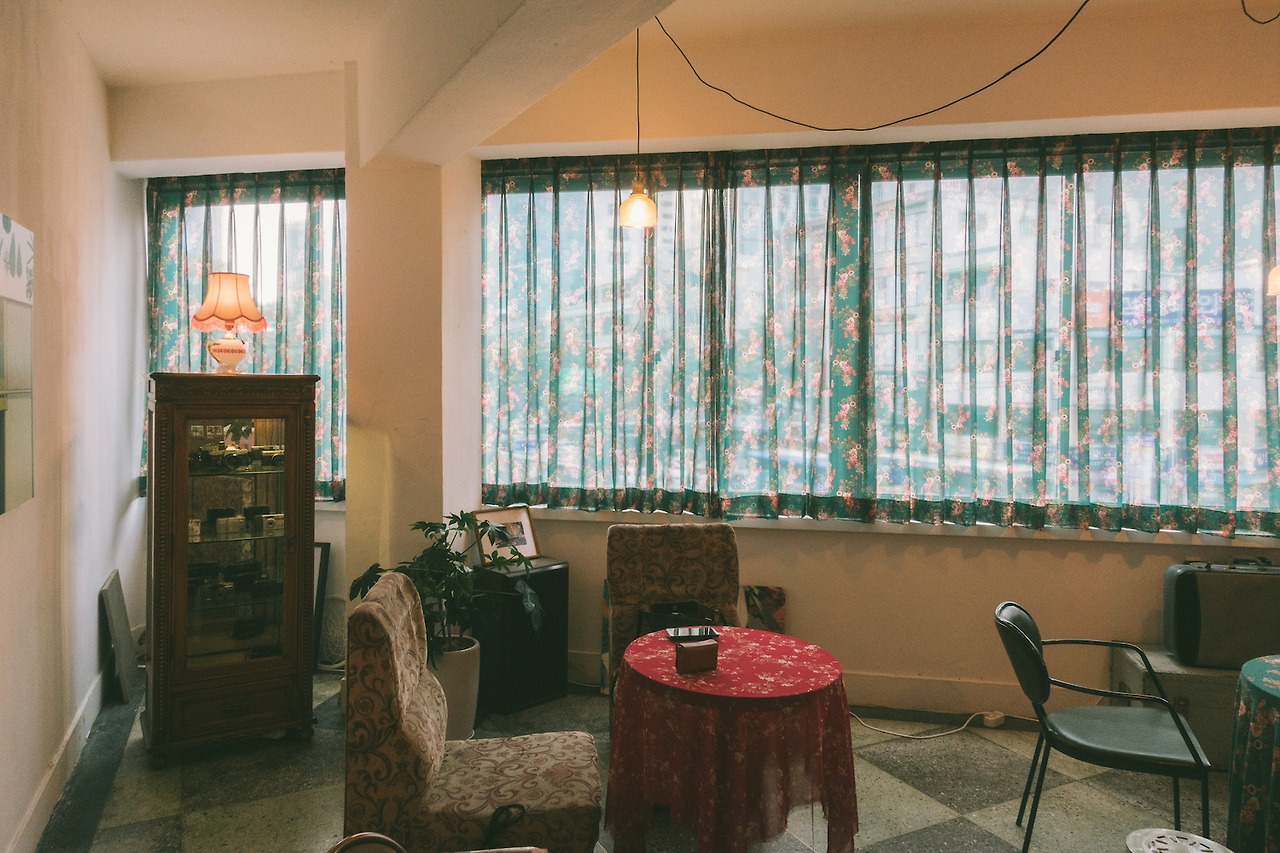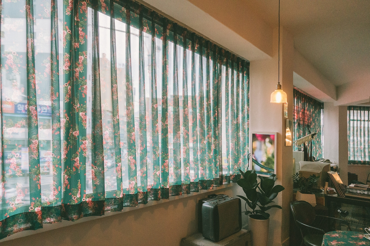 망우삼림의 배경이라고 하면, 역시 이 커튼이다. 꽃무늬 벽지라고 하면 질색했던 내가 이제 와 꽃무늬 커튼을 고른 망우삼림의 선택에 박수를 칠 줄이야? 인생은 모를 일이다. 초록 바탕의 붉은 꽃이 수놓아진 반투명한 이 커튼은 그 자체로 이미 망우삼림의 강력한 이미지가 되어버렸다. 외부에서 망우삼림을 찾아올 때에도, 내부에서 커튼 너머로 을지로의 도심 풍경을 바라볼 때에도 언제나 그곳에 있다.