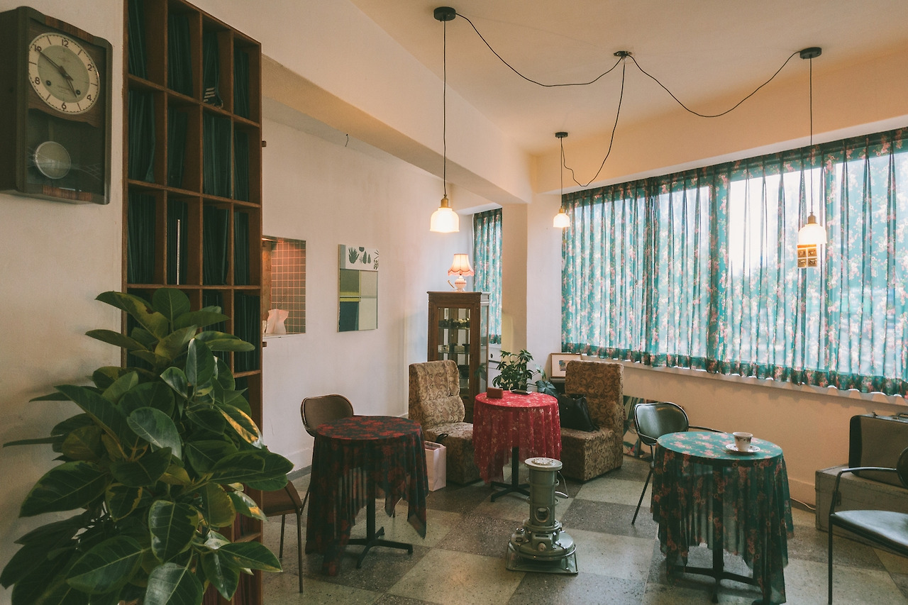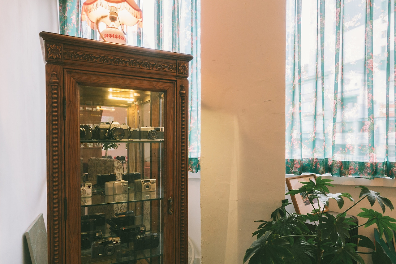 테이블과 의자가 있는 카페 쪽 공간에는 이곳이 현상소라는 것을 증명이라도 하듯 필름 카메라 장이 있고, 천장에 매달린 오래된 펜던트 등에는 슬라이드 필름 같은 것들이 매달려 있기도 하다.