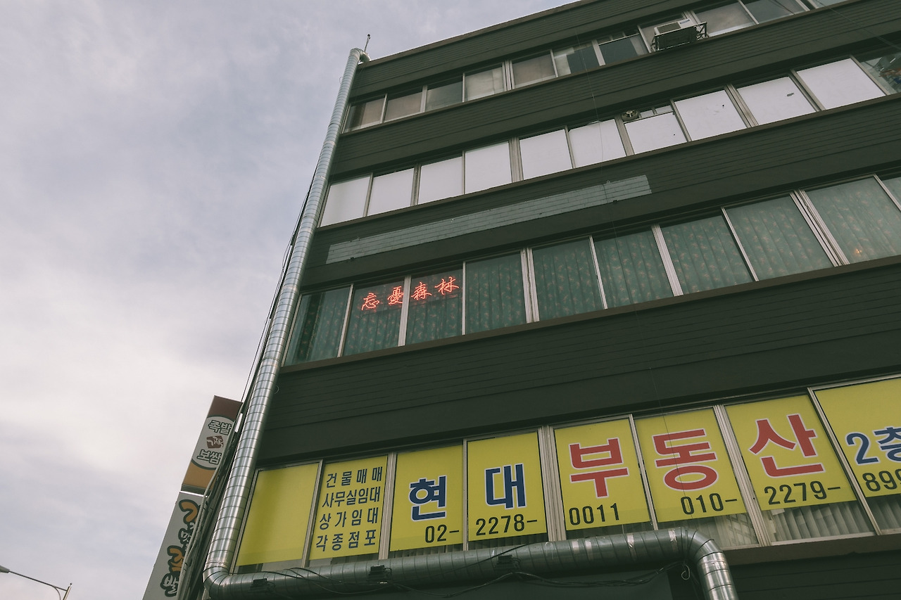 망우삼림은 사거리 모퉁이에 위치해 있어 3개의 방향으로 모두 큰 창이 나 있는데, 창을 따라 커튼이 길게 따라 이어졌다. 커튼에 둘러싸인 셈이다. 커튼과 창문 사이로 망우삼림의 유일한 간판인 붉은 네온사인이 내부에서도 커튼 뒤에서 비친다.