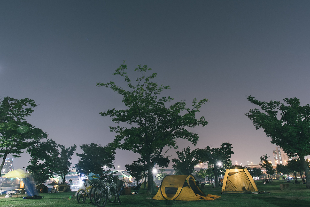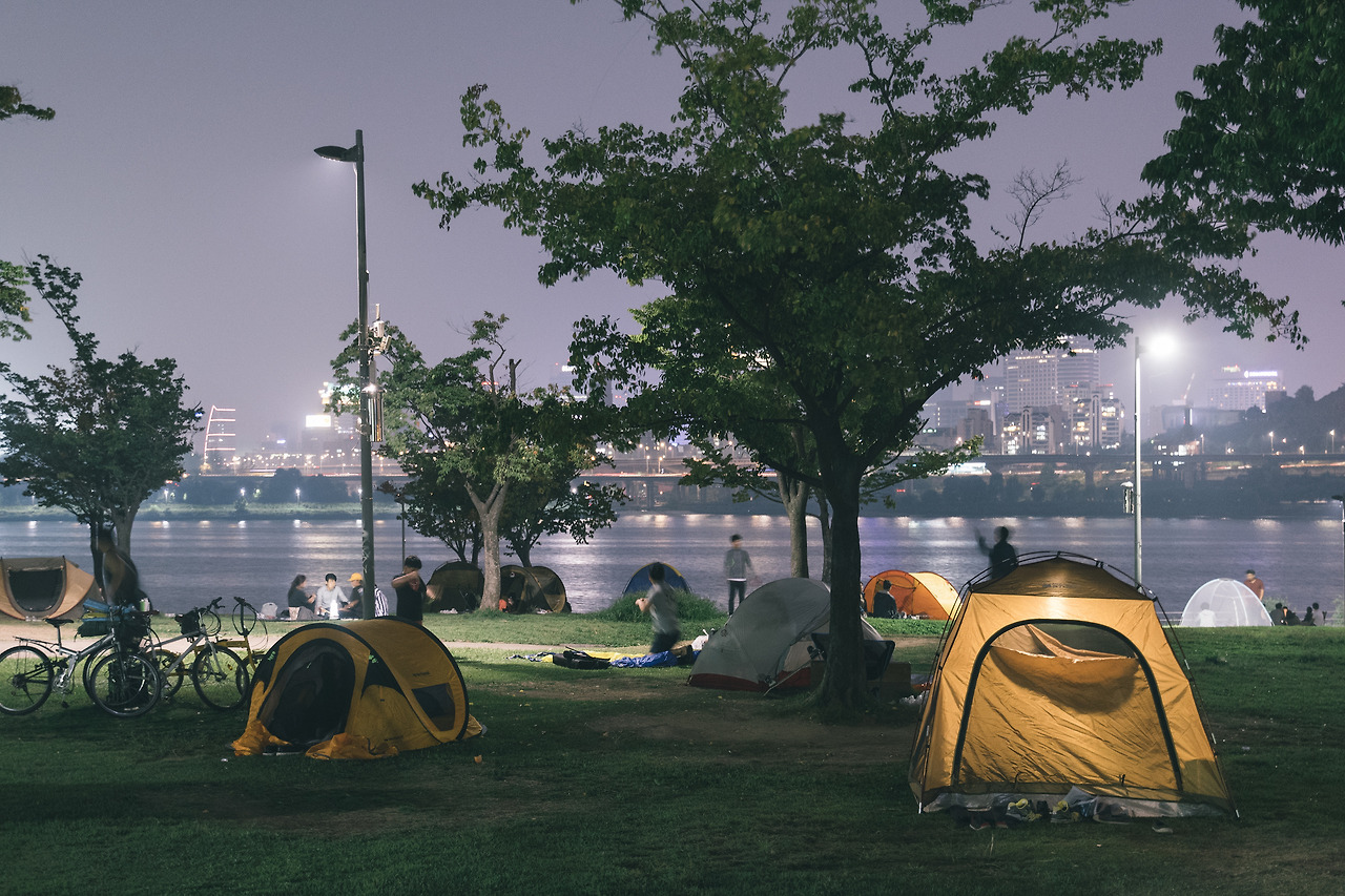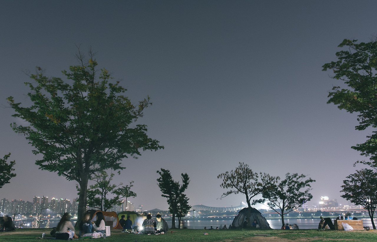 한강이 특수한 점은 그 너비가 세계의 다른 도시를 살펴보아도 압도적으로 넓다는 점이다. 너비가 넓다는 점은 서울처럼 과한 밀도를 가진 도시를 강력하게 환기시켜주는 역할을 하는데, 공기의 순환뿐만 아니라 도시 전체를 아우르는 시야를 제공한다. 특히 요새는 한강공원 조성사업이 몇 년에 걸쳐 이루어지면서 시민들은 조금 더 다양한 방식으로 한강을 즐길 수 있어졌는데, 주말 낮에는 자전거가 압도적인 비율을 차지한다. 그리고 얼마 전 가을밤에 찾았던 한강에는 텐트족들이 자리를 잡고 있었다.