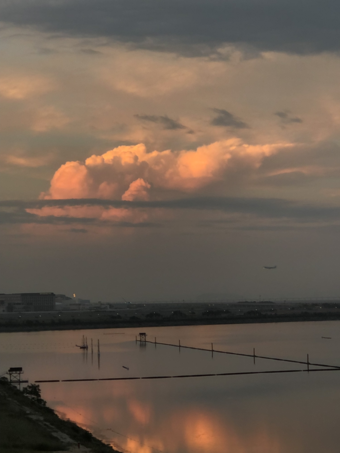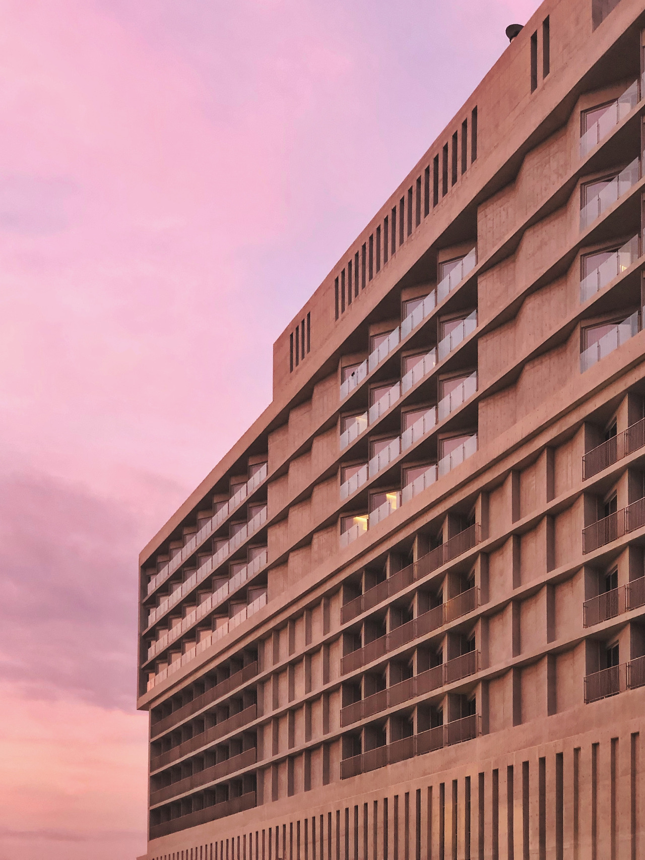 노을이 지는 모습을 한참 테라스에 나가 지켜보다가, 저녁을 먹으러 나가는 길. 마지막 노을이 짙은 색을 뿜으며 사그라드는 그 순간, 하늘은 온통 핑크빛으로 물들었다. 더불어 네스트호텔 건물도.