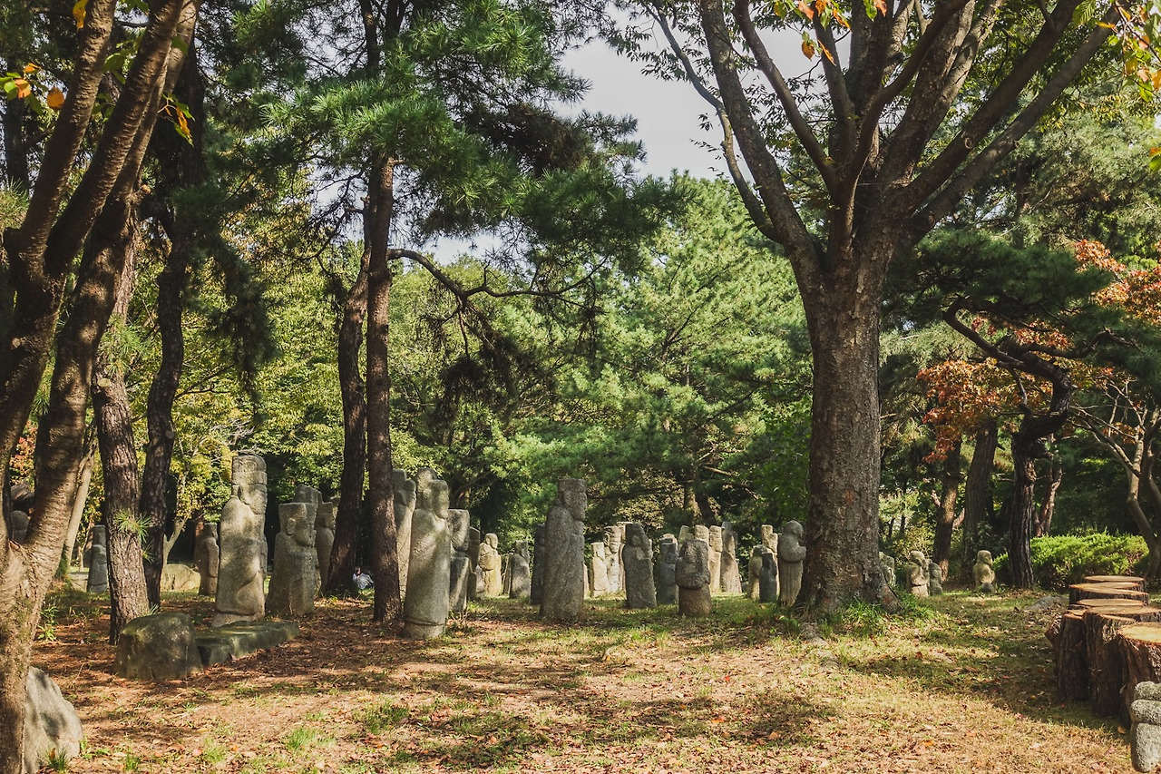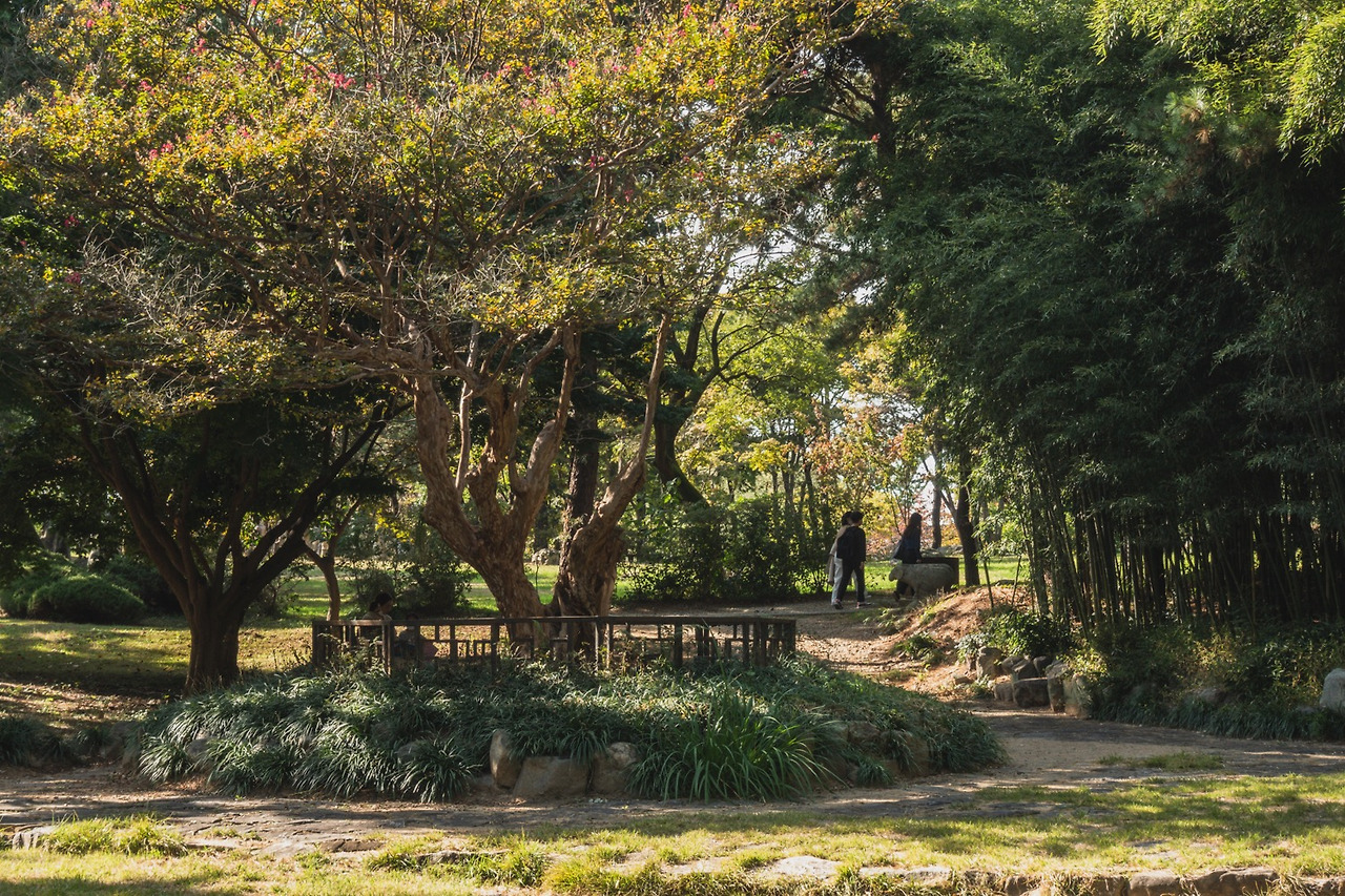 사실 나는 건물을 보러 온 것인데, 정원과 날씨와 계절이 너무 훌륭해서 마치 선물을 받은 것 같았다. 온양민속박물관 안에는 건물이 몇 채 따로 흩어져 있는데 이들을 모두 돌아보기 위해선 곱게 가꾸어지고 있는 정원을 따라 걸어야만 한다. 걷는 도중에는 아주 오래 그 자리에 머물고 있는 나무도 만나고, 작은 고인돌들도 만나고, 조각들도 지나쳐야 한다. 약도를 보고 한 바퀴를 돌아도 좋고, 무작정 일단 걸어봐도 좋다. 길을 잃어도 어렵지 않고, 힘들지 않은 크기의 정원이다.