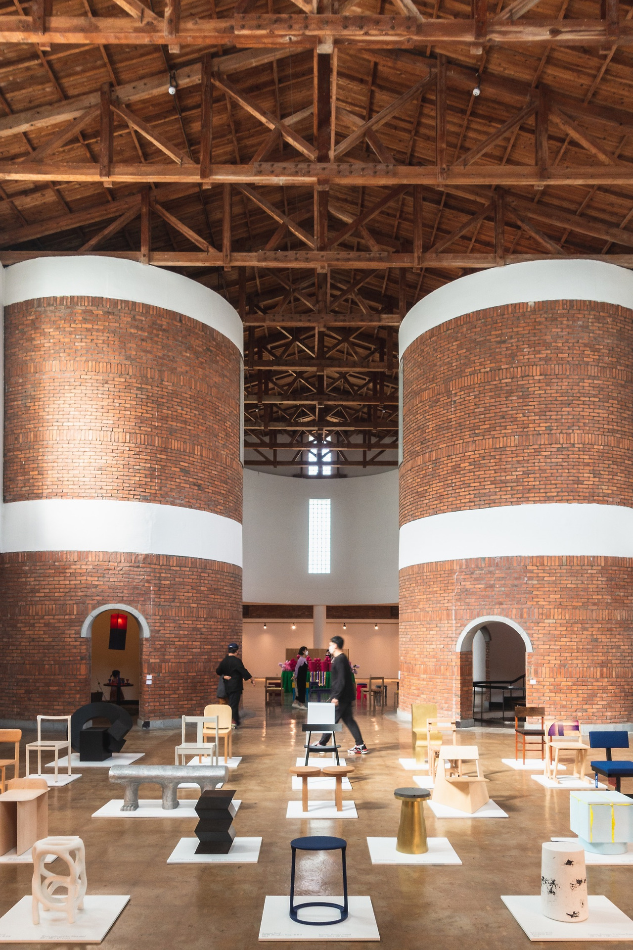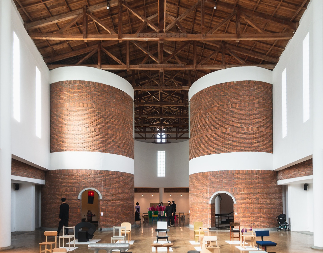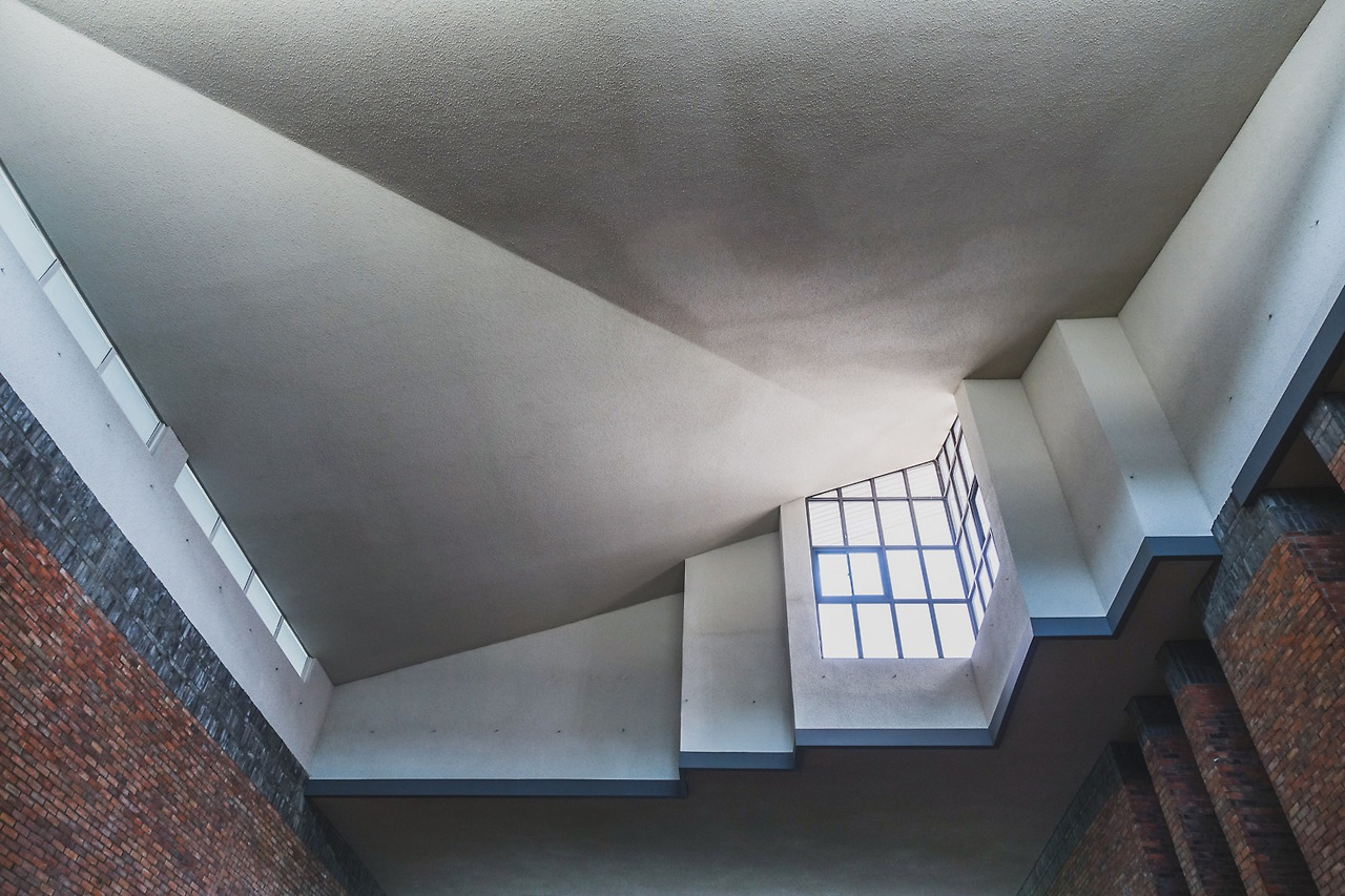 로비를 감싸고 있는 붉은 벽돌과 함께 삐쭉 솟은 하얀색 천장이 먼저 보인다. 이런 천장을 볼 때마다 샘이 난다. 이런 천장이 하고 싶다. 조명도, 스프링클러도, 환기 장치도 달리지 않은 매끈한 천장. 대각선으로 두 면이 만나 우뚝 솟은 부분에는 코너로 창이 뚫리고, 낮은 부분에도 가로로 긴 창이 뚫려 있어 작은 스포트라이트밖에 없는 공간인데 로비가 어둡지 않다. 빛은 충분했다.