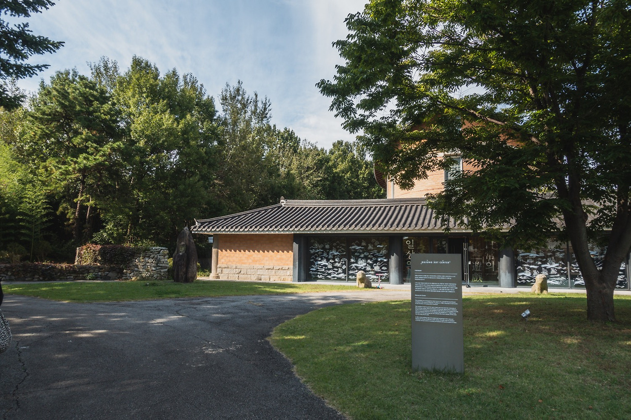 구정아트센터는 온양민속박물관의 한쪽, 카페와 맞닿아 있는 곳에 나지막이 자리하고 있었다. 자신의 존재를 세상에 쩌렁쩌렁 소리치지도 않고, 그렇다고 자신의 모습을 숨기기 위해 땅 속으로 기어들어가지도 않은 채 주변의 나무들과 함께 고요하고 묵묵하게 자리를 지키고 있다.