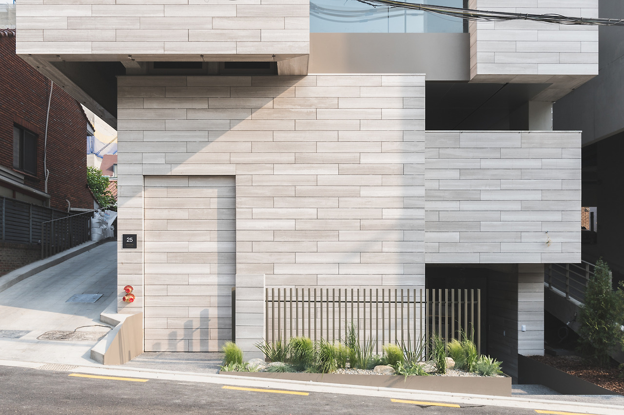 매스감이 있길 원하는 것과 창이 많았으면 좋겠다는 요구는 상충된다. 매스이길 원한다는 것은 보통 벽으로 막혀야 한다는 뜻이다. 그래서 논현이의 모습은 일면 폐쇄적으로 보이기도 한다. 전면임에도 불구하고 각 층마다 실의 절반 정도는 벽으로 막혔다. 건물의 측면엔 아예 창을 두지 않았다. 창을 매우 중요시하는 문화에서는 내리기 힘들 수 있는 결정이었지만, 창이 없는 벽이라서 느껴지는 힘이 분명 있다.