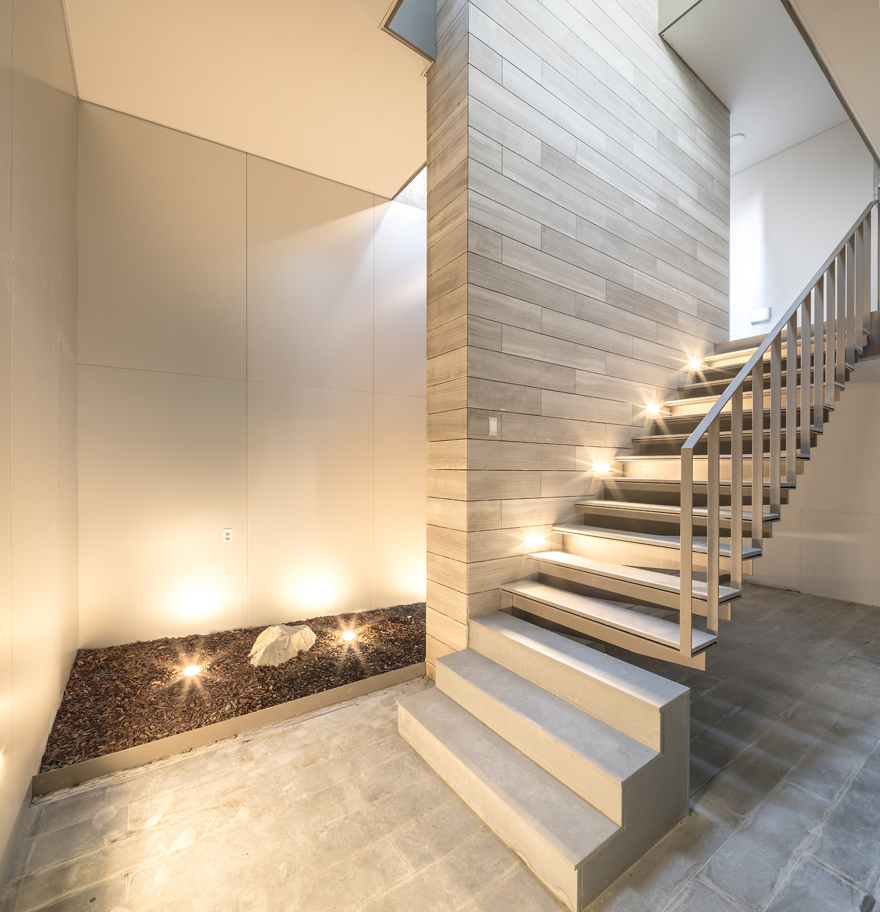 지하층엔 선큰³을 뒀다. 건물에 진입한 후 계단을 통해 내려가는 것이 아니라, 외부에서 바로 지하로 내려가는 계단으로 진입하게 한다. 지하 2층까지 바로 외부 계단을 통해 내려올 수 있다. 지하 2층이어도 독립적으로 운영되기에 무리가 없도록, 접근성을 높이고 싶었다. 최대한 빛이 들어올 수 있도록 가벼운 계단을 만들고 싶어, 계단을 모두 벽에 매달아 버렸다. 한쪽에서만 고정된 켄틸레버⁴ 계단이었다.