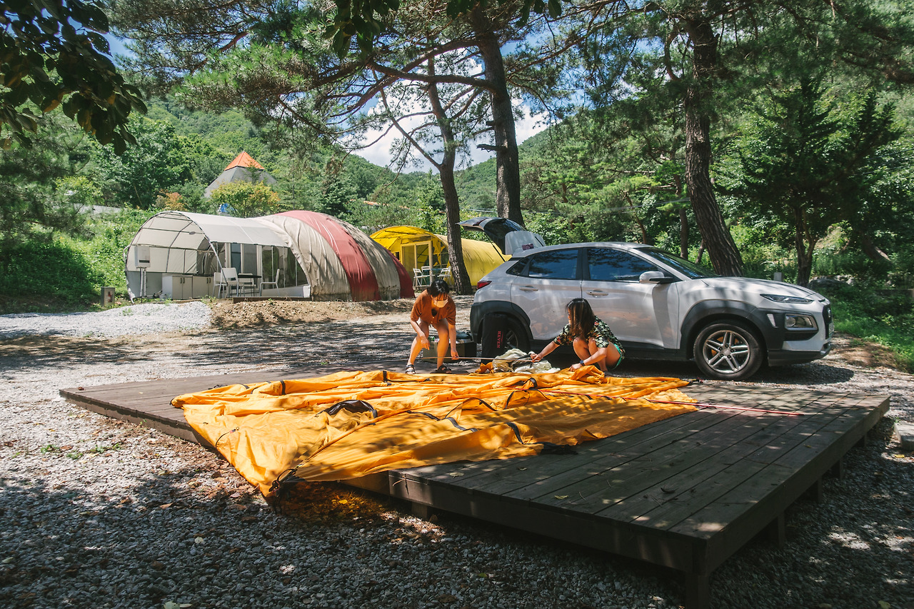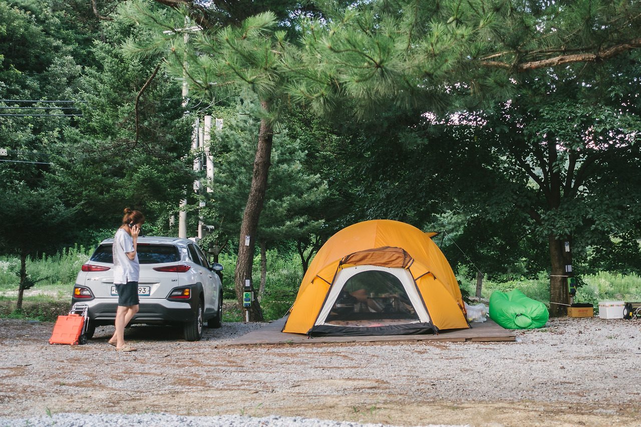 결국 우리는 다른 친구의 추천으로 원주에 있는 캠핑장의 데크 하나를 빌렸다. 가격은 얼마인지, 전기는 끌어다 쓸 수 있는지, 늘어선 데크 중에 어떤 데크가 제일 좋을 것인지, 차량을 데크 옆에 바로 주차할 수 있는지 등은 생전 처음 캠핑에 도전하는 민진이가 맡아 꼼꼼하게 알아봐 주어서, 좋은 자리로 구할 수 있었다. 도착하기 전엔 알 수 없었지만, 심지어 나무 그늘이 있는 자리이기도 했다. (민진이의 의도였나? 그건 잘 모르겠다.)