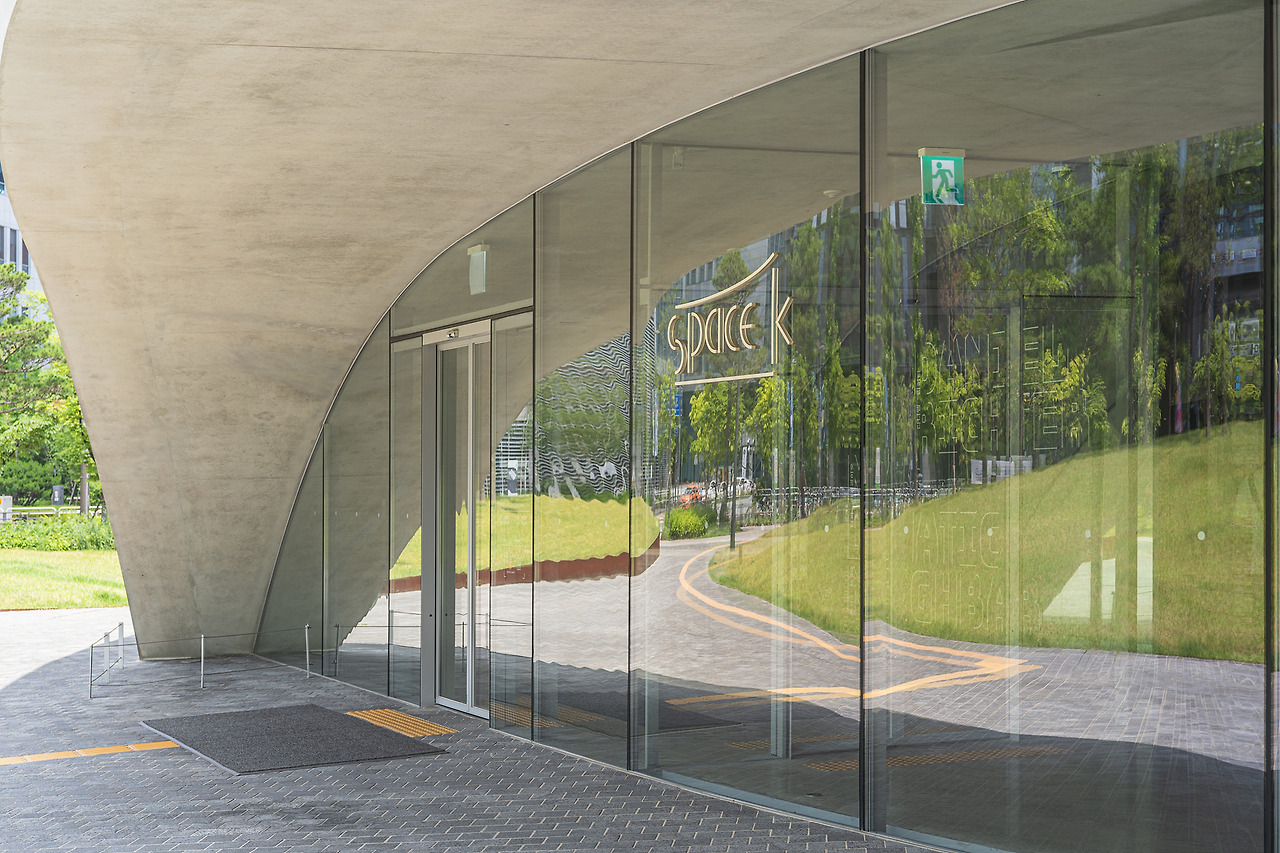 미끈한 회색의 외벽이 공원 안에 있는 다른 완만한 언덕들과 자연스레 어우러지며 사람들의 발걸음을 이끌었다. 사방이 열린 공원에서 사람들은 언덕과 콘크리트의 둥근 호가 이끄는 방향으로 걸어갔다. 언제라도 스페이스K에 들러 전시를 볼 수 있을 만큼 미술관은 공원을 지나는 사람들과 가까웠고, 원한다면 스페이스K의 좁고 기다란 틈을 통해 옥상으로도 오를 수 있었다. 옥상으로 향하는 계단 아래 그늘에서 해를 피하며 잠깐 시간을 보낼 수도 있었는데, 떠있는 두꺼운 콘크리트 천장은 텐트 안쪽에 들어가 있는 것과 같은 아늑함을 주기도 했다.