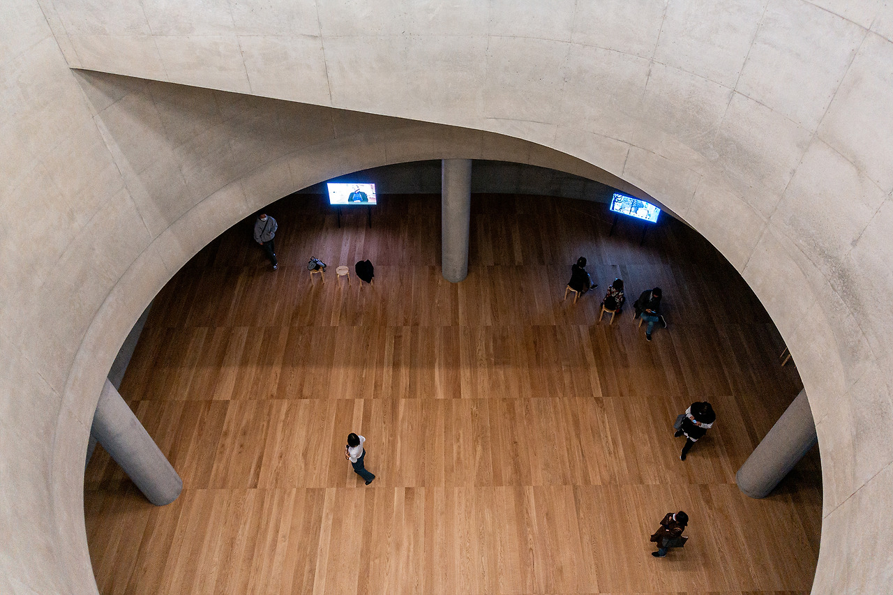 1층에서 내려다보았던 둥근 공동(空洞)은 수미상관처럼 전시공간 처음과 끝에 자리한다. 이제는 지하 3층에서 천장을 올려다보면 마치 물방울 혹은 소라 껍데기의 실루엣처럼 조각된 콘크리트 벽이 보이고 그 뒤론 지상 1층 천장 조명이 일렬로 늘어서 있다. 창이 없는 지하 공간이지만 답답함을 느끼게 되지 않는 것은 오로지 이 나선의 빈 공간 덕분일 것이다.