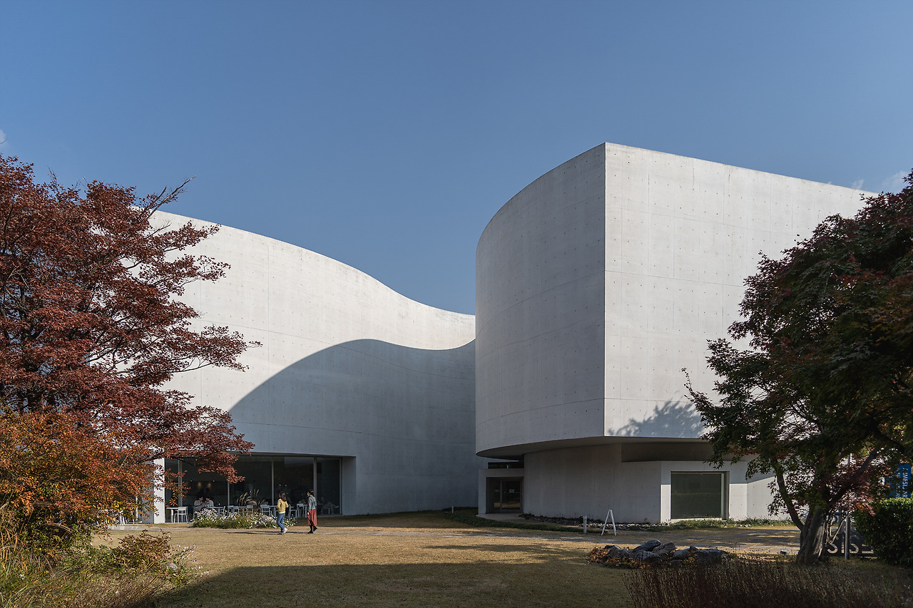 미메시스 아트 뮤지엄의 파사드는 앞마당과 이어지며 매끈한 곡면을 만들어 낸다. 첫눈에 시선을 사로잡는 형태다. 움푹 들어간 형태의 건물 모양은 마치 말발굽 같기도 하고, 어쩌면 무언가를 담는 주머니 같이도 생겼다. 원도 아니고, 호도 아닌 곡면은 어떠한 수학적인 정의에도 속하지 않고 물속을 유영하듯 자유롭게 움직인다.