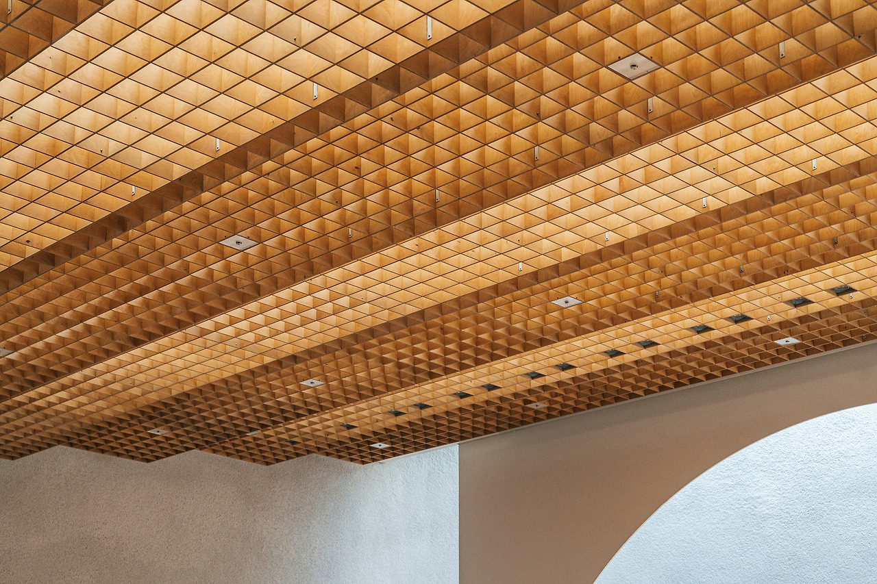 거대한 원의 공간을 그려냈기 때문에 자칫하면 둔탁해 보일 수도 있었을 것이다. 그러나 섬세하게 조직된 천장의 목재 그리드는 대각전의 공간을 세심하게 엮어낸다. 대각전에 입구에서부터 한 계단씩 낮아지는 의자들과 달리 천장의 그리드는 땅의 리듬에 맞춰 점점 더 높아진다. 공간의 옆면에서 바라보면 점점 커지는 크레셴도 표시처럼 대각전은 음악적으로 읽히기도 한다.