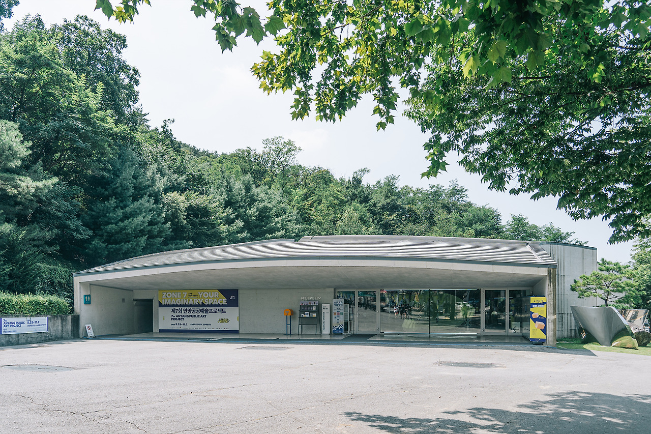 인포메이션 센터를 지나 조금만 걸으면 안양파빌리온에 도착한다. 조개껍데기 같은 쉘 형태의 지붕을 가진 흰 건물은 뒷산의 실루엣을 그대로 닮아있어 자연스레 하나의 풍경으로 녹아든다. 포르투갈의 현대 건축가인 알바로 시자가 설계한 건물답게 부담스럽지 않고, 과하지 않은 외벽의 곡면은 어느 방향에서도 다른 형태로 읽힌다. 이 작은 단층 건물은 이름도 가설 건축물을 뜻하는 파빌리온이라는 단어를 붙였다.
