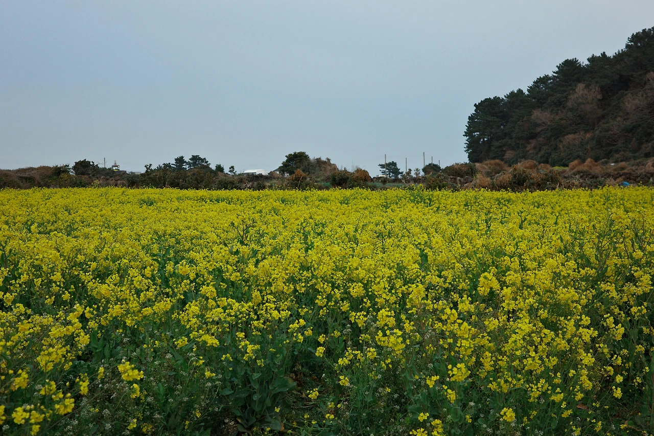 40분 정도를 쉬지 않고 뛰었다. 노란 유채꽃이 만발한 꽃밭에 도달해서야 멈춰 숨을 가다듬었다. 제주도에 와서 만개한 유채꽃을 보는 것은 또 처음이었다. 항상 유채꽃의 시기를 놓치곤 했다. 빔이 유채꽃의 열매가 뭔지 검색해 달라 하여 유채는 사실 배추와 양배추의 자연교잡종이며 유채에서 나온 기름이 바로 카놀라유라는 사실을 알게 됐다. 카놀라유의 기원을 단 한 번도 궁금해하지 않았다. 생각보다 유채는 가까운 곳에 있었다.