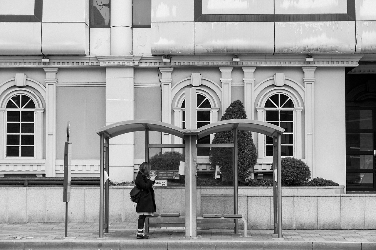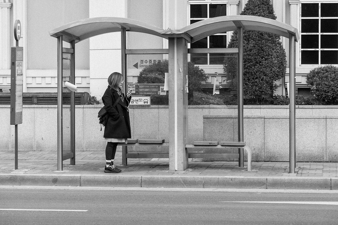 친구(이하 양양이)와 나는 반대쪽에서 버스를 탄다. 몰래 찍어서 양양이에게 카톡으로 보내주려고 찍었던 것인데, 생각해 보니 겨울 옷차림으로 낮에 버스를 기다리는 모습을 찍을 수 있는 것은 흔치 않은 기회였다. 회사 앞 도로에는 차가 많아, 신호를 기다리다가 얼른 매고 있던 카메라를 들어 10장 정도를 찍었다. 지나가는 차들을 피해, 버스 정류장 안에서 버스를 기다리는 친구의 모습. 이 사진이 2016년의 마지막 사진이 되었다. 마지막 퇴근길에 찍은 마지막 사진.