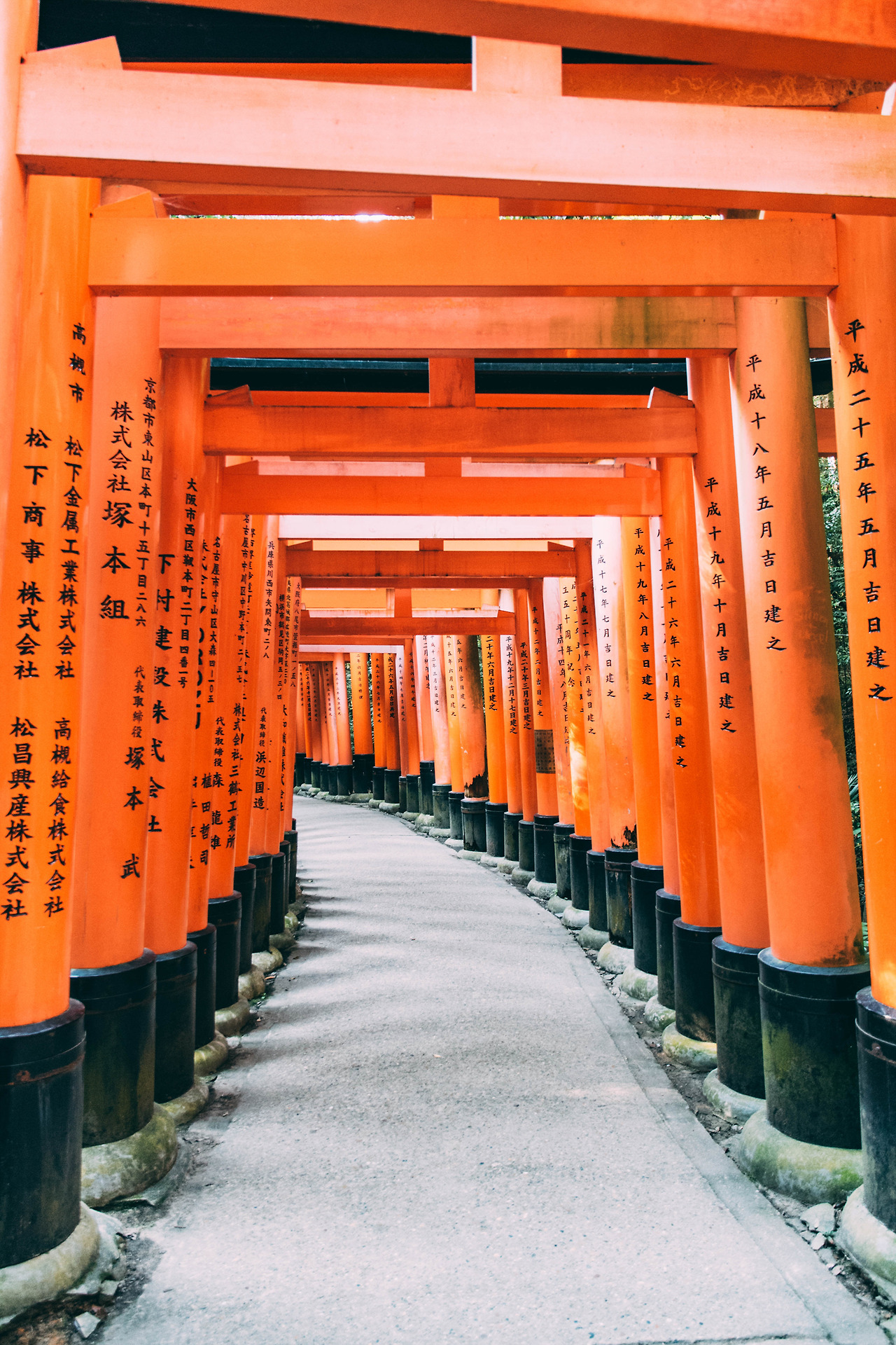 높이가 5m 쯤 될까. 같은 크기이지만, 미묘하게 기둥의 두께와 높이가 어긋난 채로 마치 동굴에 들어가는 것 같은 느낌마저 주는 이곳은 문들의 연속이지만, 벽과 천장으로 둘러싸인 것과 같은 공간이다. 그렇기 때문에 강한 햇빛이 내리쬐는 여름에도, 눈이 내려 산행하기엔 위험한 계절인 겨울에도 이곳, 후시미이나리 신사는 열려 있다. 빽빽하게 세워져 있는 토리이가 햇빛과 눈을 동시에 막아주기 때문이다. 특히 겨울에는 흰 배경에 붉은 토리이가 더 도드라져 보일 것이다.