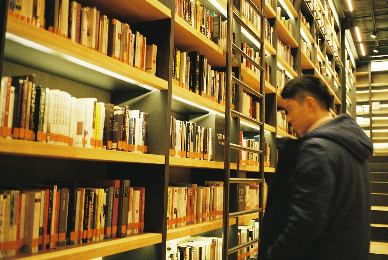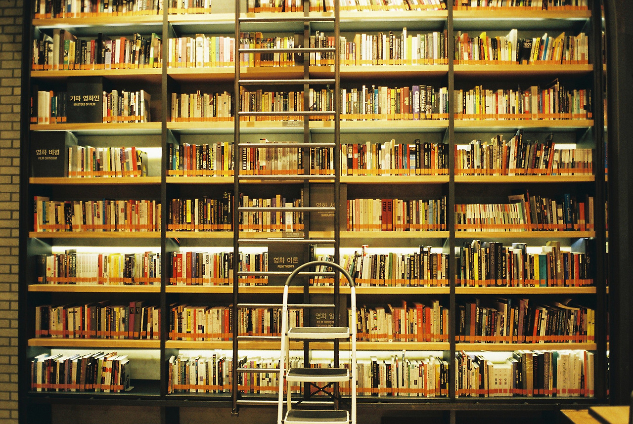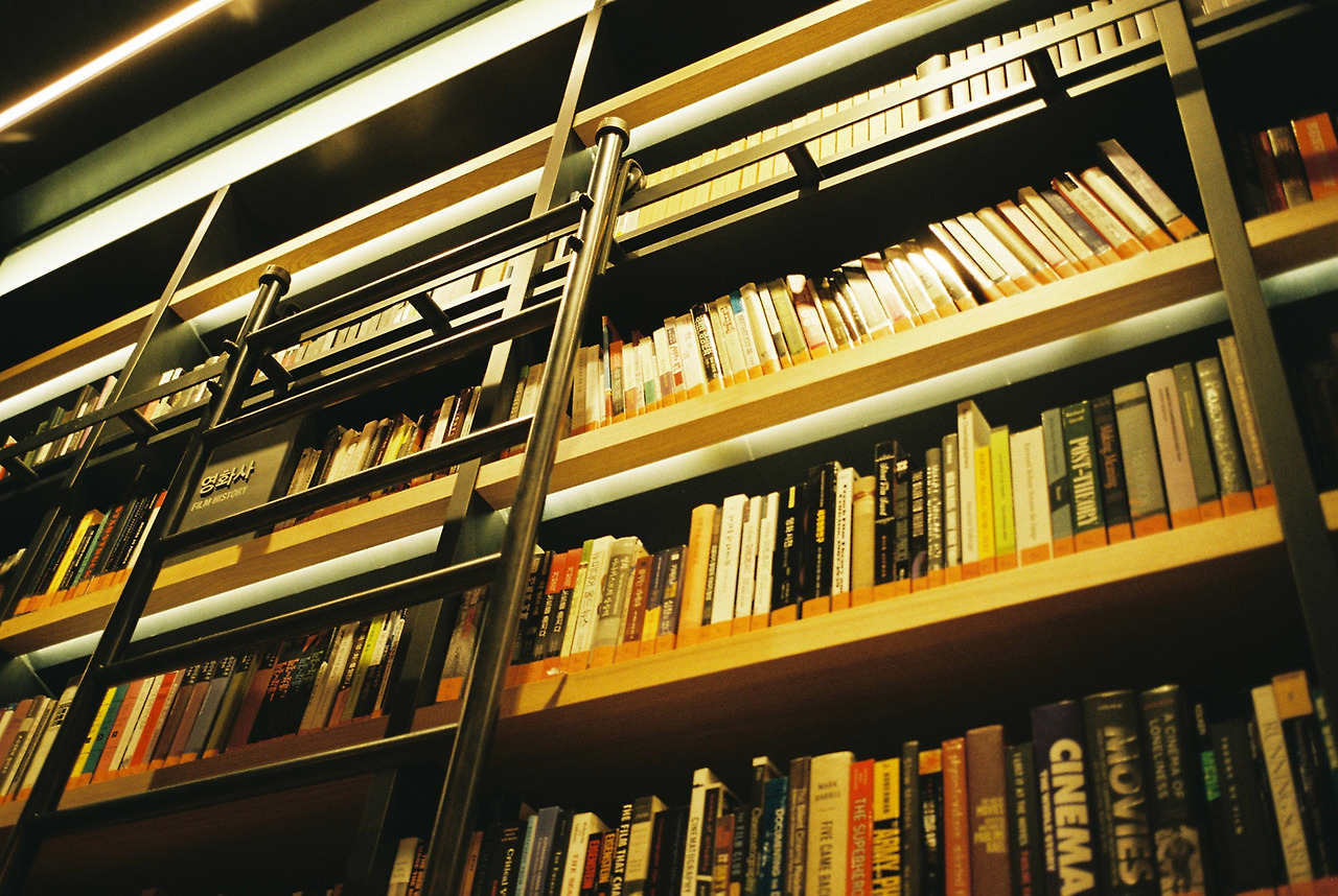 도서관이 도서관이기 위해서는 책이 필수적이다. 책이 어떻게, 어디에 위치해있는지는 도서관의 성격을 규정하는 아주 중요한 디자인 요소다. 시네 라이브러리에서는 크게 양 옆의 벽, 두 면에 책장이 거의 전부라고 할 수 있는데 그 높이를 천장까지 닿도록 책장을 쭉 높였다. 높은 책장에 올라설 수 있도록 사다리를 만들어 놓았는데, 옆으로 움직일 수 있도록 레일을 달아놨다. 레일이 있으니 사다리는 옆으로 기대어 있을 필요가 없어졌고, 책장 주위는 깔끔하게 정리될 수 있었다.