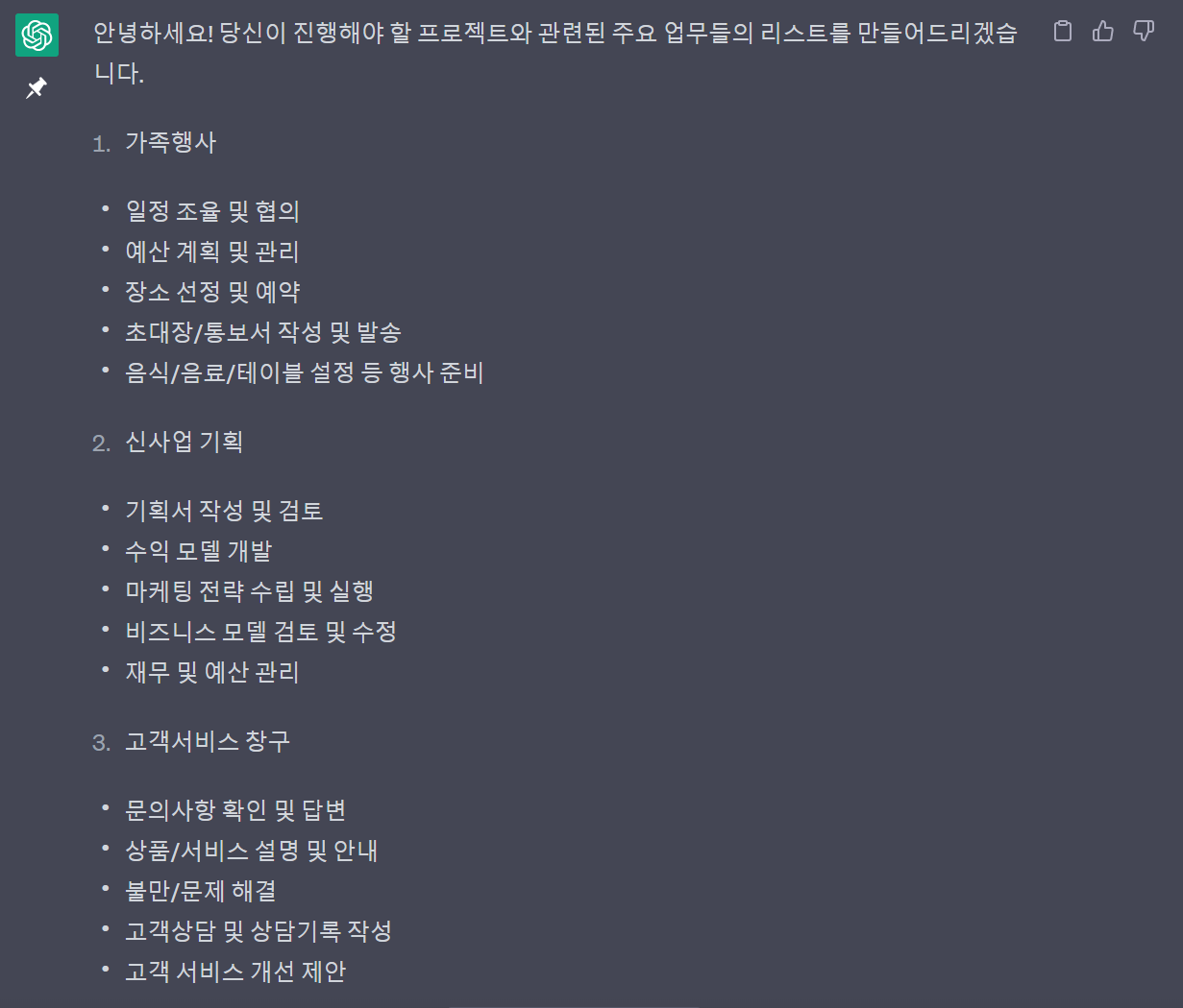 너는 10년 차 직장인이야. 이번 달은 가족행사와 신사업기획, 그리고 고객서비스 창구 등의 프로젝트를 진행해야 해. 각각의 프로젝트와 관련된 주요 업무들의 리스트를 만들어 줘.