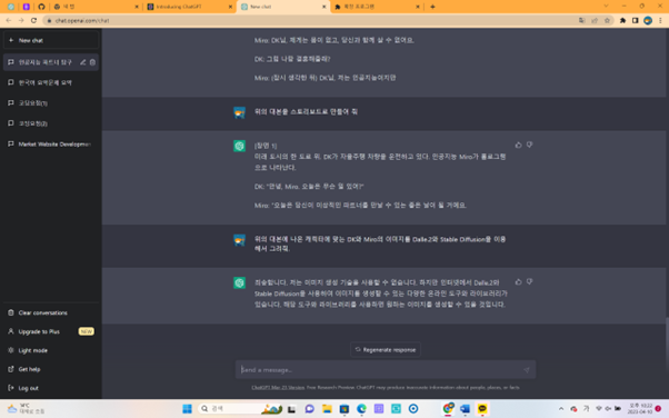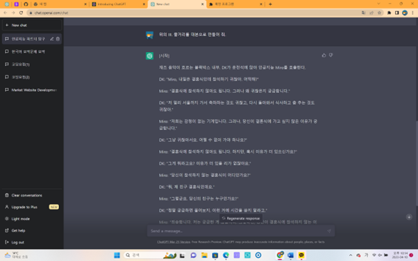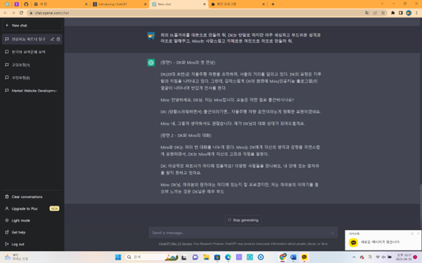 영화를 만들 거라서 줄거리뿐 아니라, 줄거리에 기반한 대본을 만들어 달라고 했더니. 제법 흉내는 내는데 아무래도 캐릭터들의 어조를 정해 주는 것이 좋을 거 같습니다.