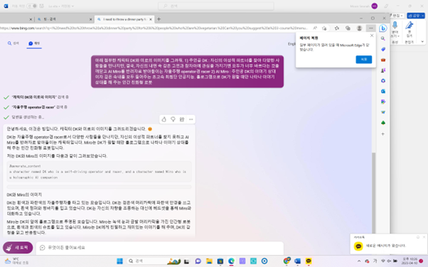 빙챗에 캐릭터를 붙여 넣고 이미지를 그려달라고 하니, 적합한 이미지가 되도록 이미지 가이드를 기가 막히게 해 줍니다. 그러나 그림을 직접 그려주진 않는군요.
