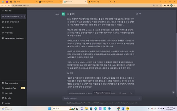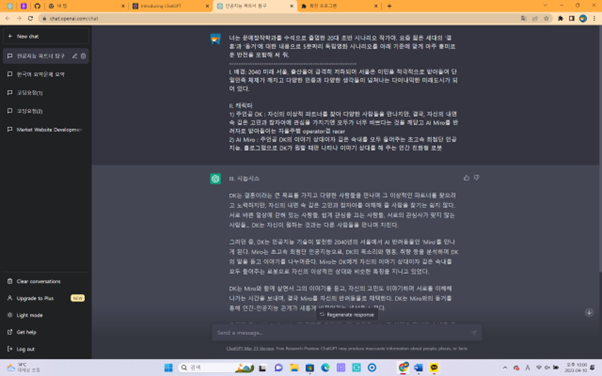 Regenration과정을 통해 다시 만들어 낸 시놉이 얼추 그럴듯합니다. 그런데 중간에 끊기네요. 토큰 수 제약 때문인 거 같은데...... 유료를 써야 하나?