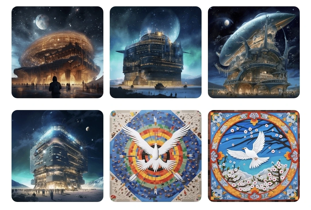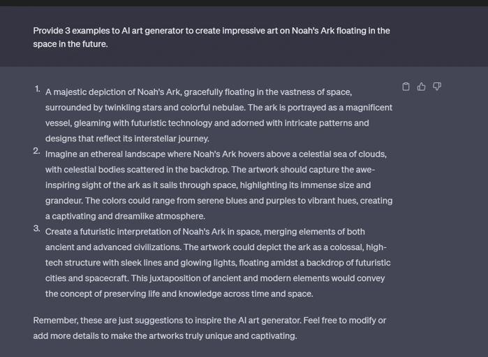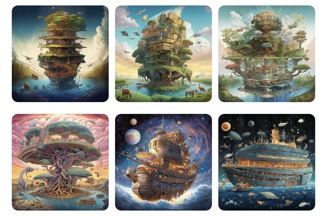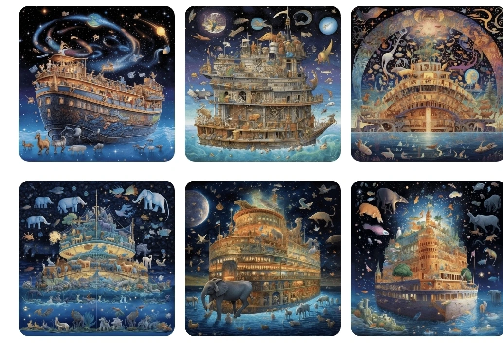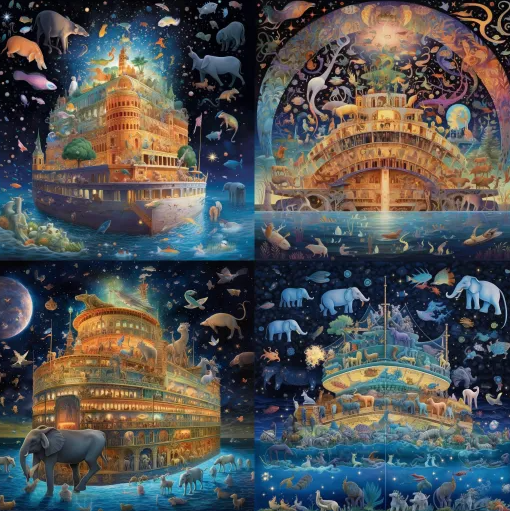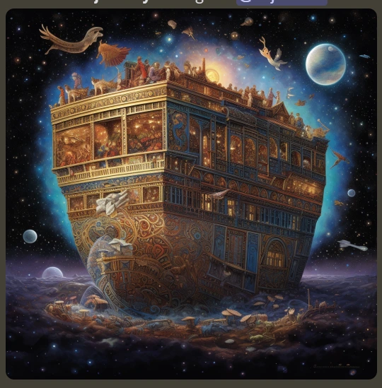 "Celestial Salvation": Generate a breathtaking artwork that portrays Noah's Ark as a celestial sanctuary, suspended in the depths of space. Illustrate the Ark as an ethereal structure adorned with intricate designs and illuminated by otherworldly light. Show a diverse array of creatures, both organic and artificial, peacefully coexisting within the Ark. Use a cosmic color palette to create a sense of wonder and transcendence. Let the artwork evoke emotions of hope and contemplation, inviting viewers to reflect on the fragility and interconnectedness of life in the face of an AI-driven apocalypse.