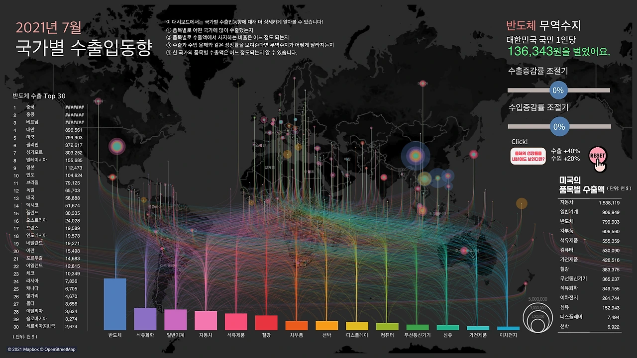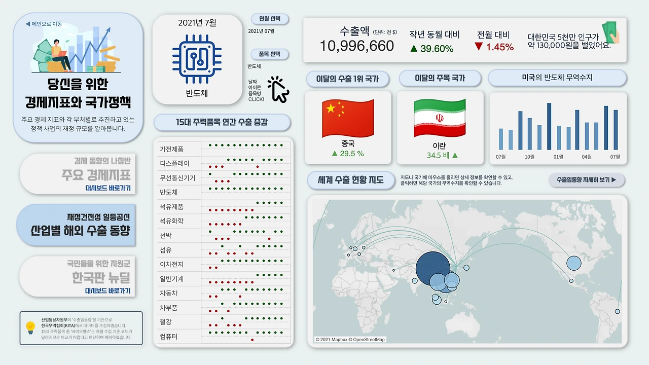 물론, 대부분의 데이터는 얻지 못했다. 몇몇은 다른 데이터로 대체했지만, 다행히 산업통상자원부에서 수출입동향 데이터를 구해 원하는 대시보드를 만들 수 있었다.