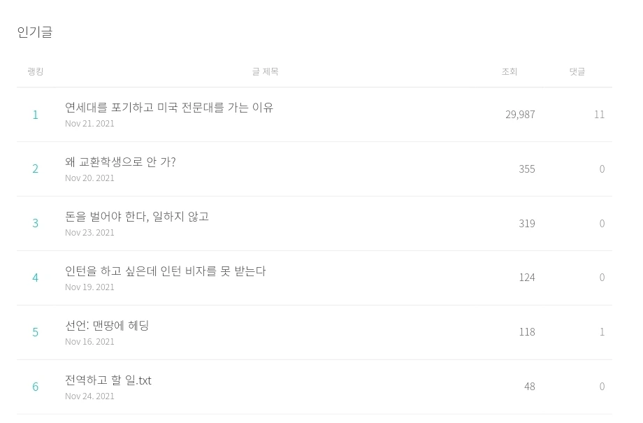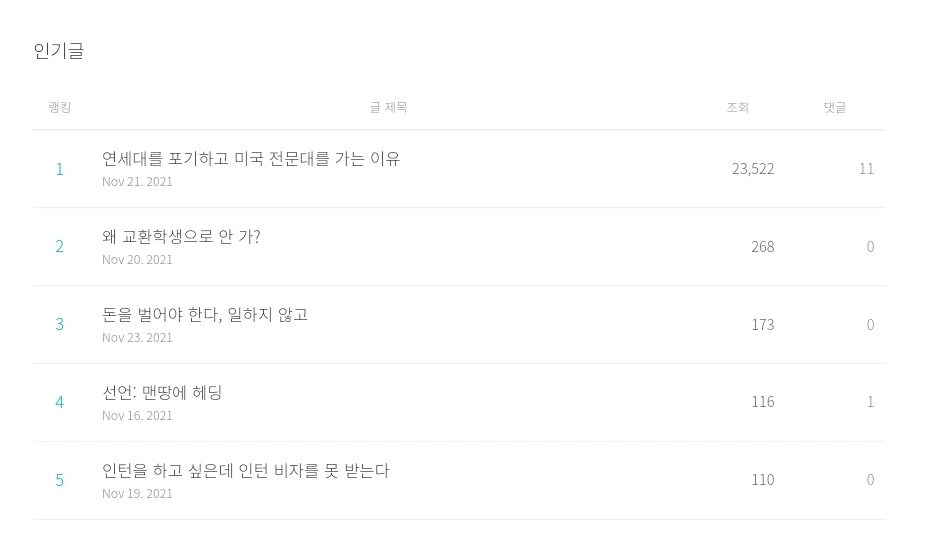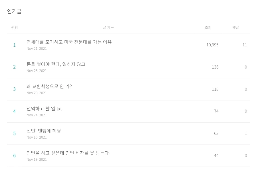 폭풍 같은 3일이었다. 엊그제 저녁 식사를 하고 핸드폰을 확인했는데 <연세대를 포기하고 미국 전문대를 가는 이유> 조회수가 1만을 넘었다는 알림이 도착했다. 그 뒤로 3일 동안 첫날 2만 명, 둘째 날 3만 명, 오늘 오전까지 1만 명이 내 글을 읽었다. 더 이상 급증하지 않는 것을 봐서는 메인에서 내려간 것 같다. 게시글 4개, 첫 글 올린 지 일주일 만에 이룬 쾌거다. 구독자도 32명으로 늘었다. (친구들도 절반 정도는 차지하는 것 같다.)