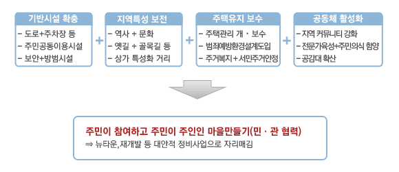 자치구 별로 정비계획을 수립하고 구역을 지정한 후 지차제장이 정비기반시설 및 공동이용시설을 설치하면, 주민 스스로 주택을 개량하는 방법으로 진행됩니다.