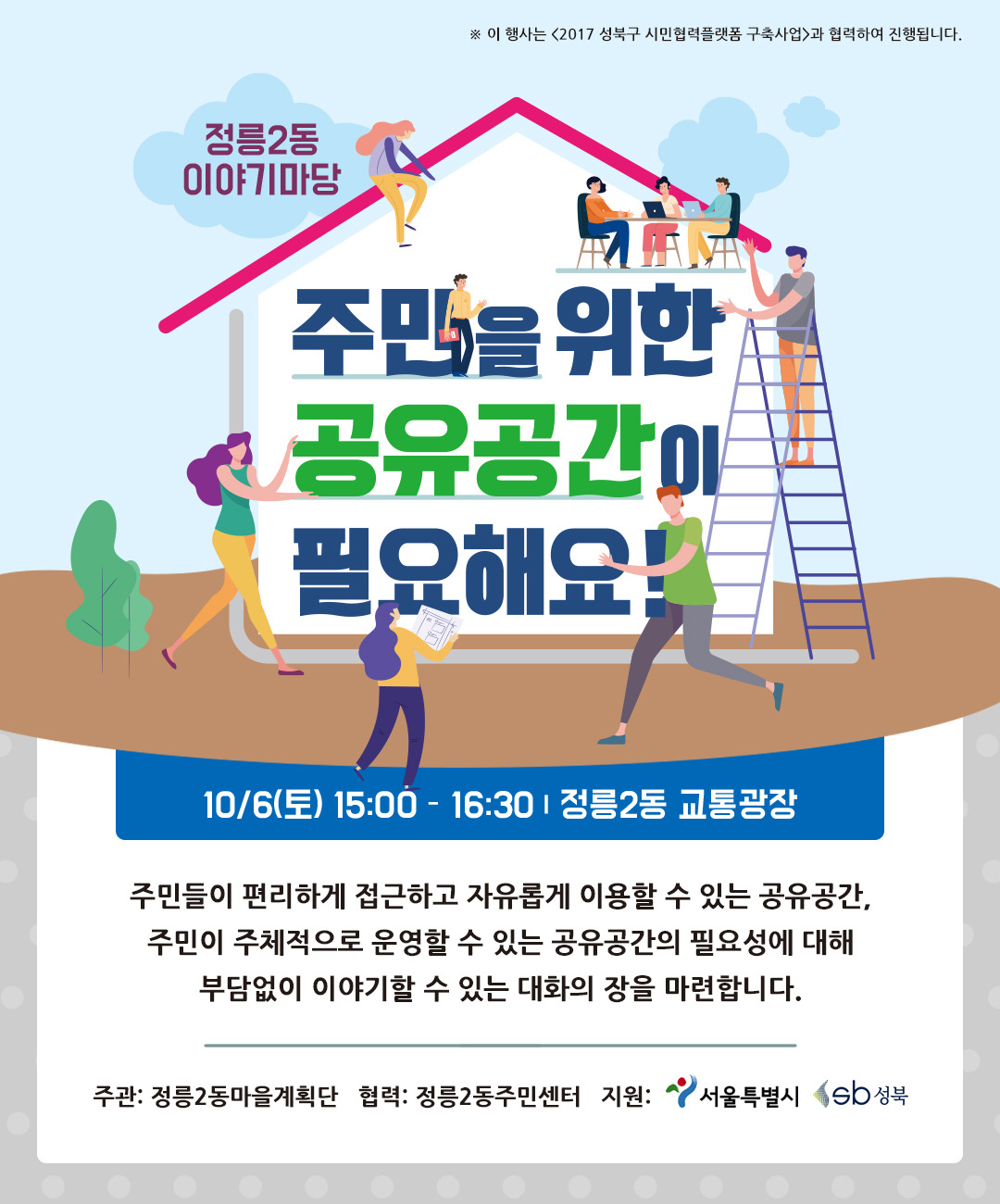 성북구 시민협력플랫폼 구축사업은 성북구 지역시민사회의 자생적 활동 생태계 조성을 위해 활동주체들의 역량을 강화하고 지역 전반을 아우르는 포괄적 네트워크 구축을 비전으로 동 기반 주민모임 성북동천, 성북 지역활동가 모임 성북마을살이연구회, 성북구 대표 지역법인 함께살이성북사회적협동조합이 컨소시엄을 구성하여 추진하는 사업입니다. (지원 : 성북구, 서울특별시)