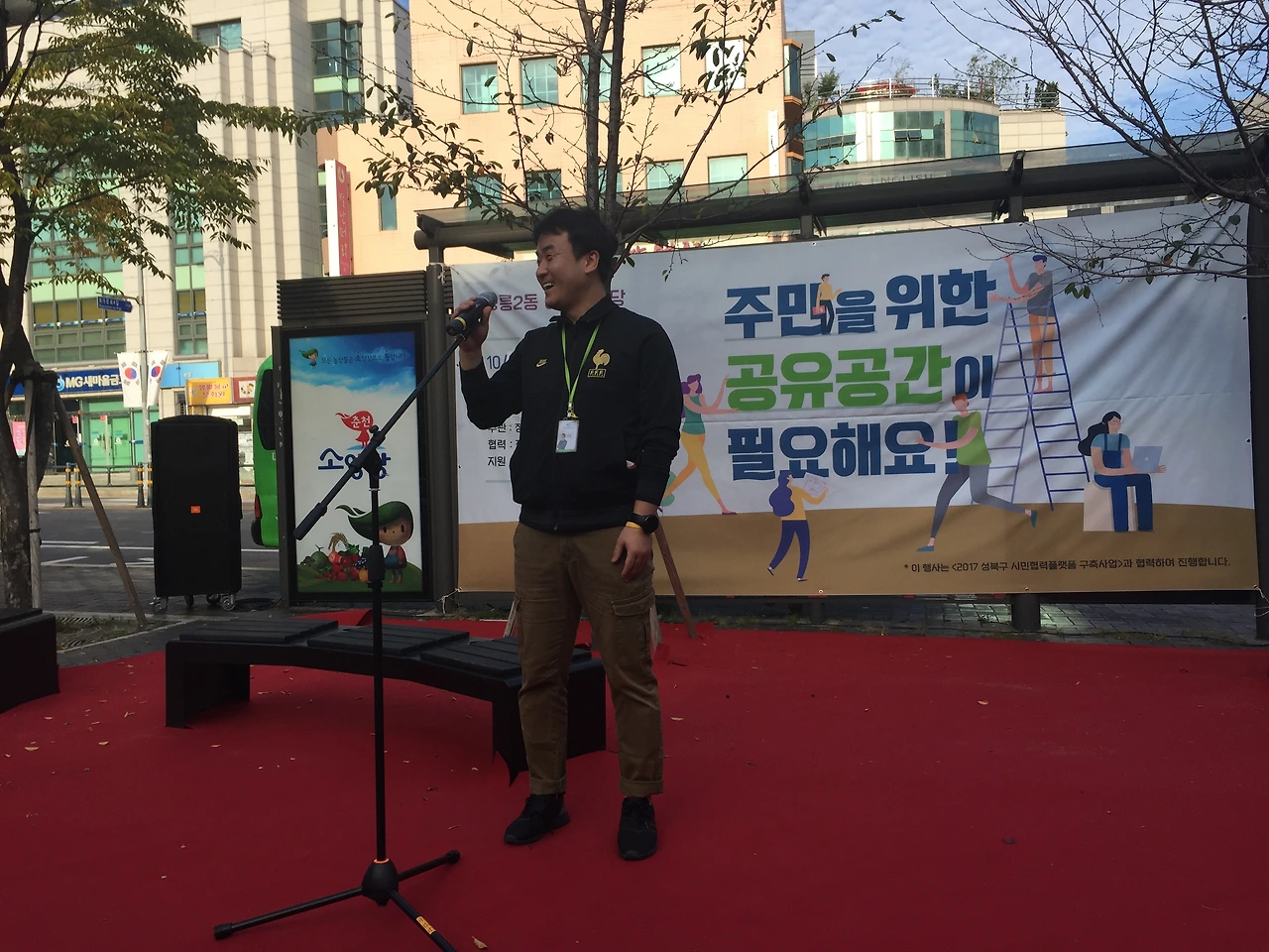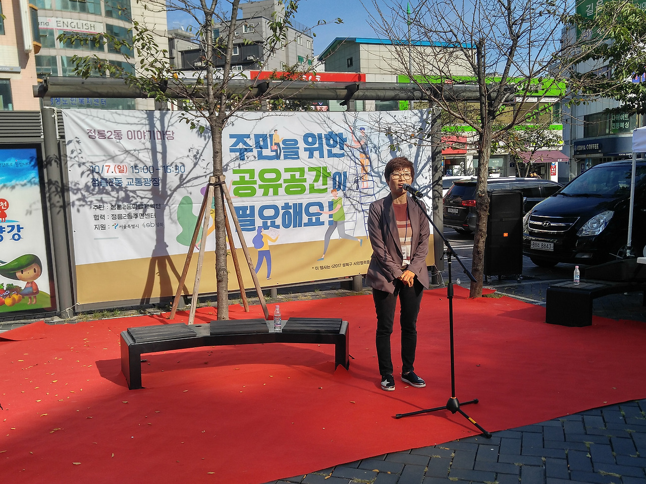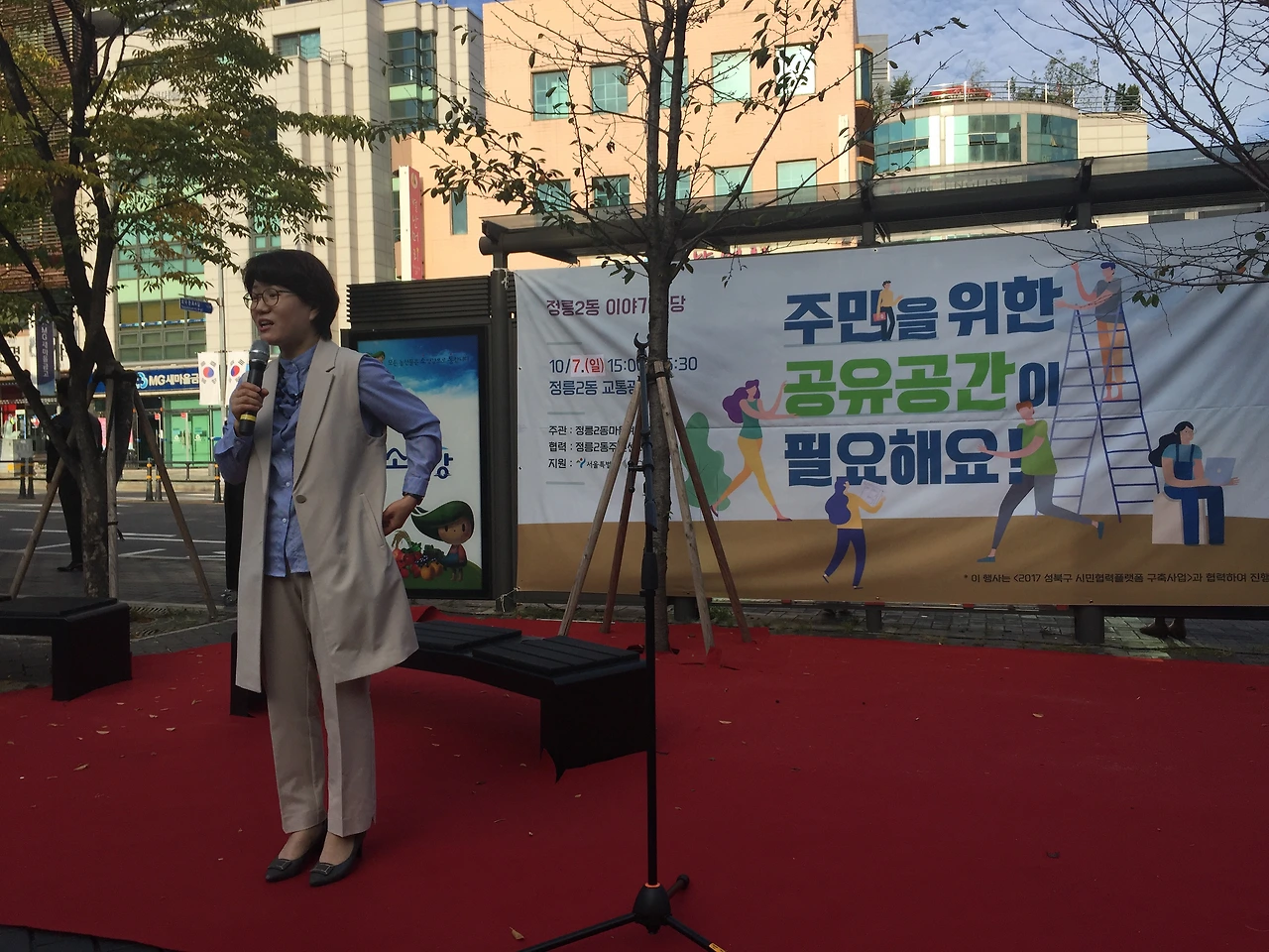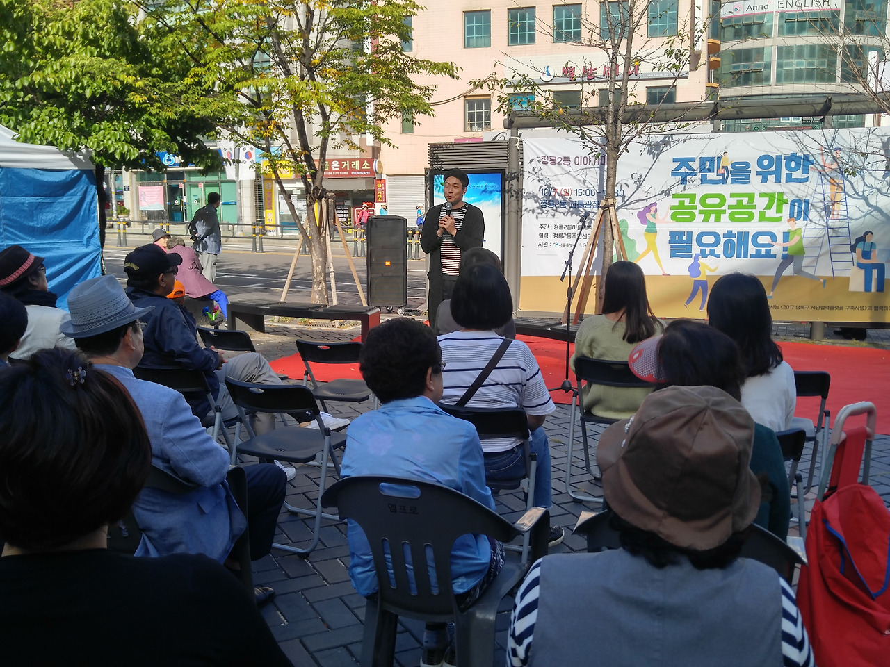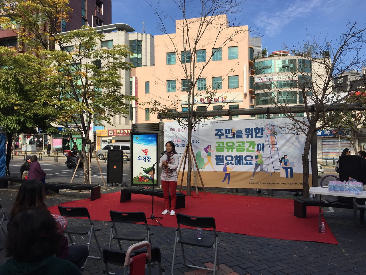 10월 7일 일요일 오후 3시, 정릉입구 교통광장에서 정릉2동 마을계획단이 주관하는 주민공론장이 열렸습니다. 정릉2동 어울더울 장터와 함께 진행된 이번 공론장의 주제는 ‘주민을 위한 공유공간이 필요해요’였는데요. 한정혜 정릉2동 마을계획단장의 오프닝에 이어 사회자 마이크를 받은 아트버스킹 김경서 대표는 정릉2동에 거주하는 주민 한 사람의 입장에서 함께 의견을 나눔과 동시에 행사의 진행을 맡아주었습니다. 주요 발언 내용을 정리해 보았습니다.