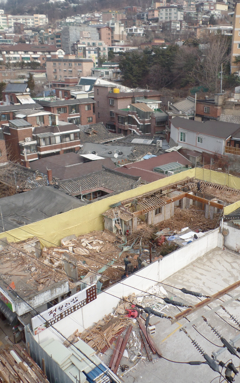 2016년 1월부터 5월까지 성북동에서 멸실된 한옥이 필자가 직접 확인한 것만 해도 다섯 개가 넘는다. 사라진 한옥은 대부분 지하철역과 가깝고, 상권이 형성된 대로변과 바로 뒷골목에 집중되어 있다. 변형되고 노후된 한옥도 있었지만 비교적 잘 사용하고 있었고, 성북동을 오가며 길에서 익숙하게 봐오던 한옥들이어서 아쉬움이 더 크다. 여러 지원제도에도 불구하고, 아직 우리 사회에서는 개인의 재산권이 공공의 경관적 가치보다는 우선순위에 놓여있다. 누군가의 욕심이라고 볼 수도 있지만, 결국은 한옥과 경관에 대한 사회적인 인식의 상승과 한옥이라는 건축물에 대한 가치가 높아져야 지켜질 수 있을 것이다. 아직은 부동산 가치가 도시와 건축에서 인식하는 한옥에 대한 가치보다 훨씬 높다.