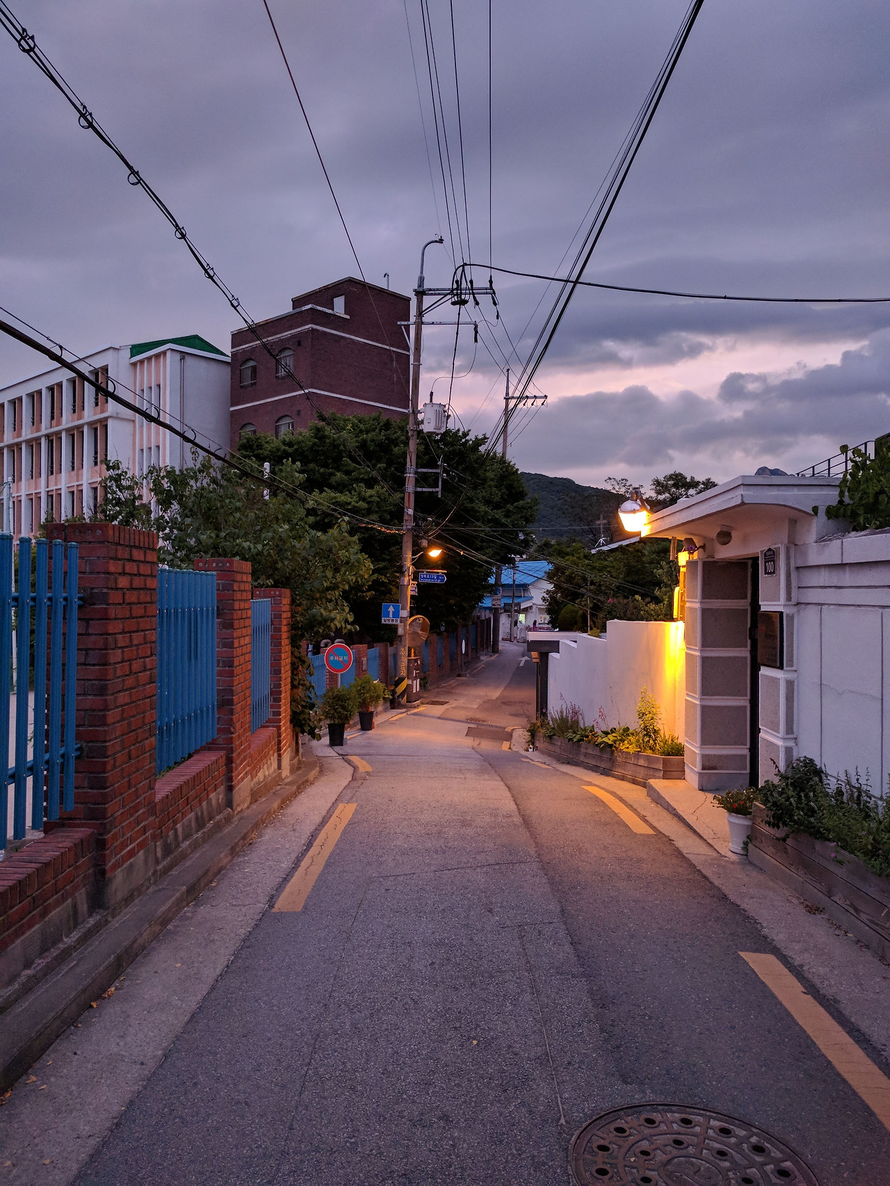 계단으로 이어진 골목길이 끝나는 곳엔 경신중고등학교가 있습니다. 캄캄한 밤, 불 켜진 교실 창문을 본 적이 있나요? 이 깊고 푸르른 밤에 우리의 아이들은 왜 저기에 앉아 공부라는 것을 하고 있는지... 안타까운 마음이 듭니다. 텅 빈 운동장일 때도, 몇몇 아이들이 산보를 할 때도 있습니다. 파란색 철창담 사이로 보이는 학교 운동장과 농구대는 행여 외로워 보이기도 하지만 환하게 불을 밝힌 경비실과 가로등이 있어 평화로워 보입니다. 이젠 학교와 집들 사이의 큰 길로 나왔습니다. 언덕 위의 길입니다. 아담한 단독주택과 사람들이 모여 사는 공동주택들이 있는 곳. 밤하늘이 가운데로 난 한적한 그 길은 까마득하게 잊고 지내던 푸르렀던 청소년기의 기억을 소환해줍니다. 오른쪽에는 밤 한가운데 놓인 중고등학교가 곁을 지키고 있고 왼쪽에는 불빛 새어나오는 집들이 있습니다. 화단이 있는 집도 있어요. 참 어여쁜 꽃들이 반겨주고 차가운 시멘트 사이로 나보란 듯 올라와 있는 민들레도 보입니다. 밤은, 그리고 길은 우리에게 많은 이야기를 건네줍니다. 한낮 태양 아래에서는 조용히 침묵하고 있던 생명들이(아마도 우리가 듣지 못하는 거지 재잘대고 있을 거긴 합니다만) 밤이 되면 소곤소곤 말을 꺼냅니다. ‘당신, 오늘도 수고했어.’라고 말입니다. 지나쳤던 생명체들의 두 팔 벌린 환대가 벅찬, 밤길. 성북동의 깊은 밤길입니다.