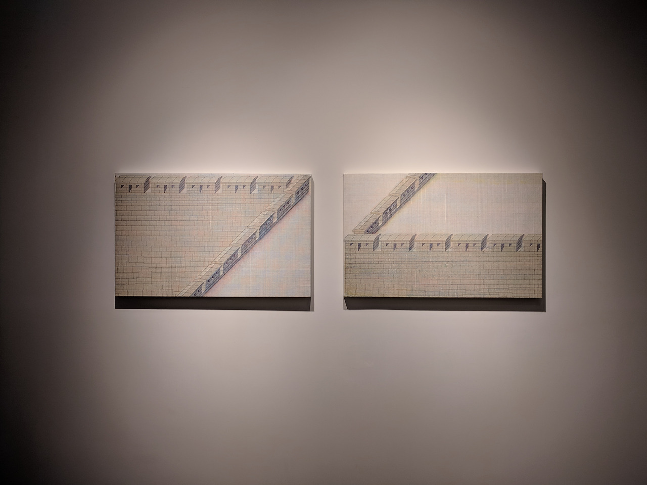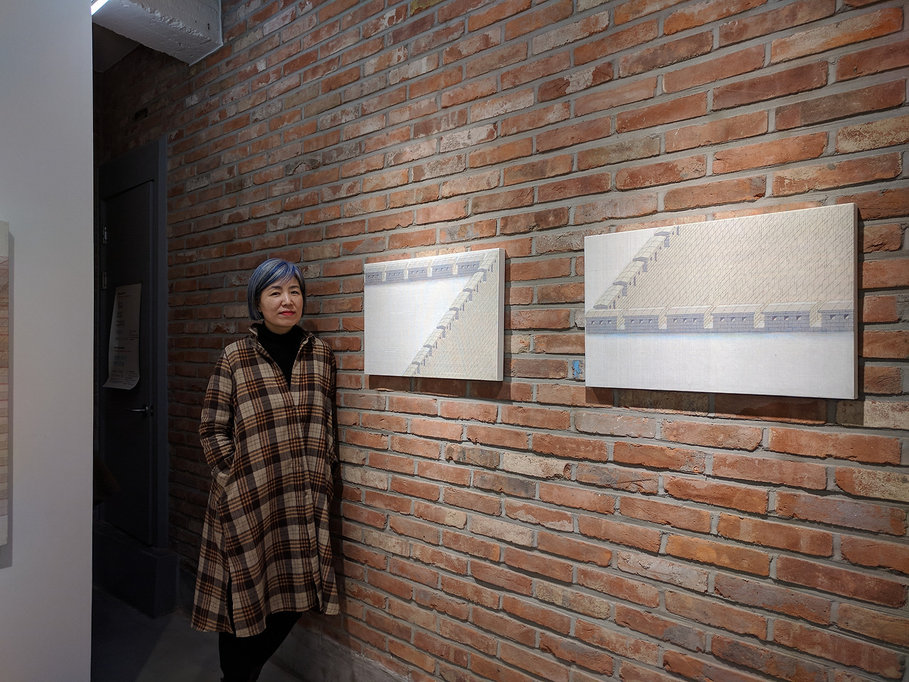 지난 11월에는 새로운 전시가 시작되었다. 두 번째 ‘장소특정적’ 전시로 기획한, 한국화 전공 유한이 작가의 『도-성-사-이 都城間』 전이다. 북정마을의 상징인 서울성곽을 주제로 작품을 선보이고 있는데 작가는 이번 전시를 준비하며 이태준의 「성」이라는 수필을 참고하여 이를 시각화하였다. 북정마을의 지도를 직접 펴 놓고 등고선 높이까지 관찰하며 자신이 재해석한 관점으로 성곽에 인접한 성 밖 마을 전경을 적막하고 담담하게 그리는가 하면, 이제는 원래의 용도로 사용되지 않는 암문을 투명한 구조물로 표현하기도 하고, 끝없이 이어질 듯한 성벽을 통해 무한함과 허무함을 단순한 필체로 표현해내고 있다. 지난해 성남문화재단 성남큐브미술관에서 「2018 성남의 발견」 선정 작가로 전시를 가졌던 유한이 작가는 건물이 흔들리는 듯한 투명한 느낌을 주며 구조물이 촘촘히 겹쳐 있는 중첩적 느낌의 건축물을 섬세한 동양화 기법으로 작업한다. 단단한 구조물들 사이에 기억해야 할 상흔들이 숨어있다고 하는데, 특히 지난 전시에는 성남이라는 도시를 미술관 벽면에 직접 제작하여 지역과 관련된 작품을 곧 사라질 일시적 벽화로 선보이기도 하였다.