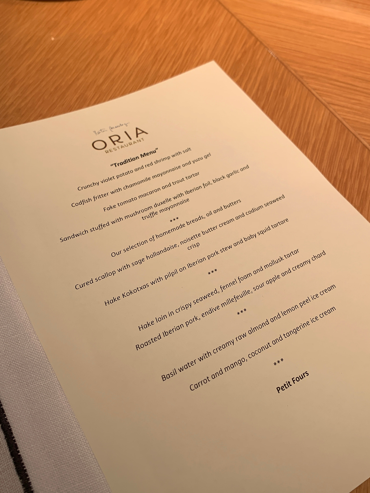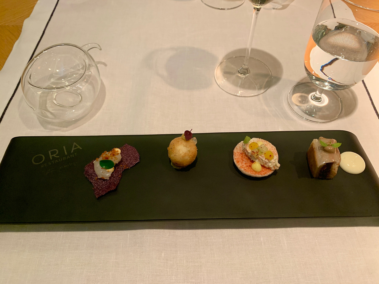 Oria는 예약제입니다. 디너 코스는 저녁 8시, 8시 30분, 9시, 9시 30분 타임이 있어요. 저희는 9시 타임으로 예약했어요. 밤 12시 30분이 되어서야 저녁 식사가 끝났습니다. 추가 요금을 내면 와인 페어링도 할 수 있어요. 프로포즈, 기념일 등에 방문하면 더 좋을 것 같아요.