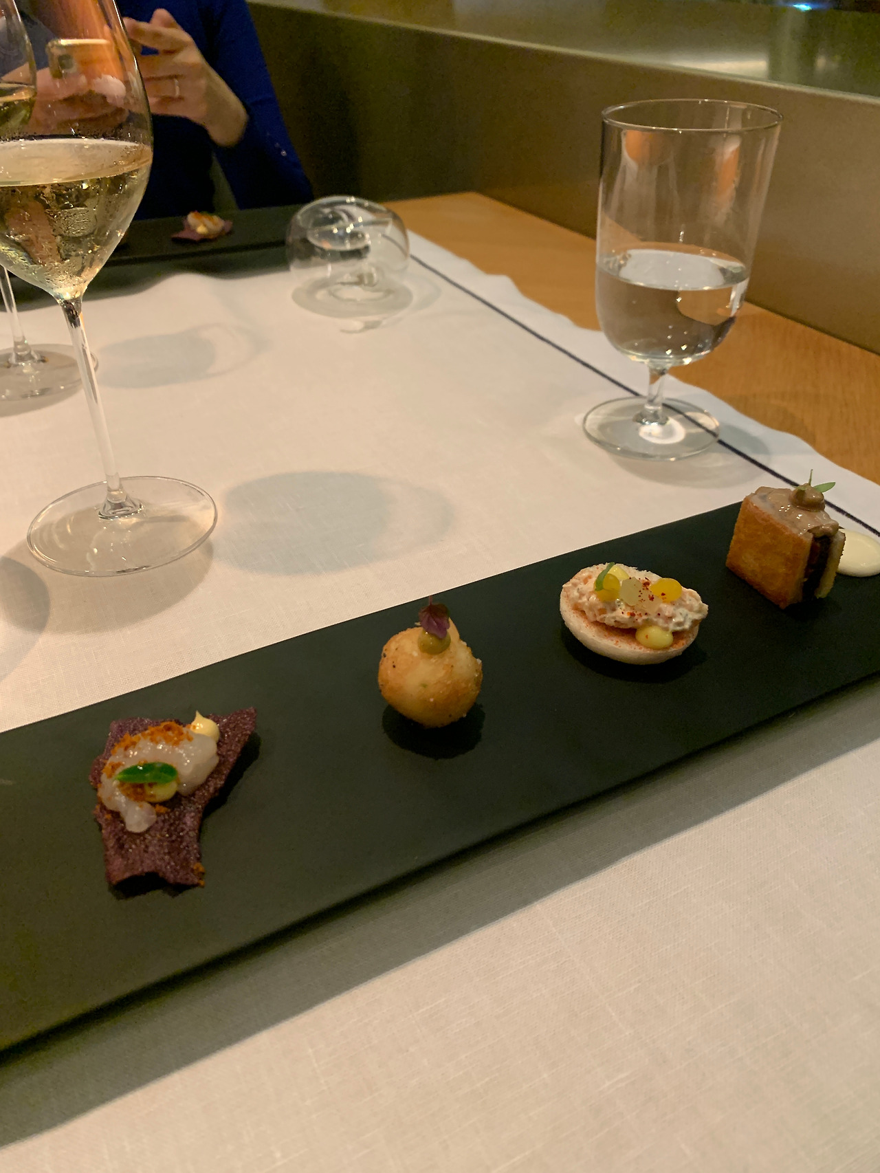 디너 코스는 식사 시간이 3시간 30분~4시간 정도 소요된다. 레스토랑에 들어가면 담당 서버가 배정된다. 우리에게 배정된 서버는 두 분이었는데 매우 친절하게 음식에 대한 스토리를 설명해 줬다. 식전 요리부터 맛있어서 후에 나올 모든 코스가 기대되었다.