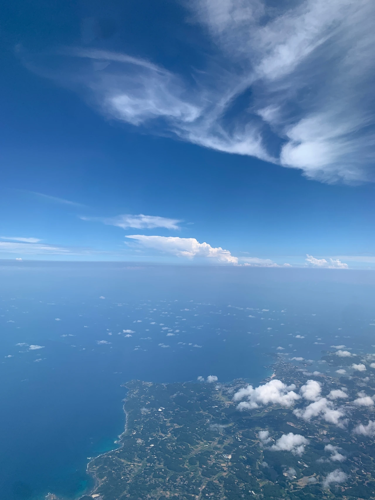 비행 중 보통 다들 좌석 모니터 속 영화를 볼 때, 비행기가 지나가는 항로만 뚫어지게 보는 나. 아쉽게도 이번에는 모니터가 없었다. 대신 창밖 하늘과 구름, 지형을 관찰하기 시작했다. 이 구름이 저 구름 같고 이 하늘이 저 하늘 같아 보이지만 사진을 수십 장 찍었다. 파란색 수집가라고 해야 할까. 더위는 잠시 잊은 채 설렘을 기록하며 1시간 20분을 날아갔다. 저 밑에 보이는 낮은 집들과 일본어가 적힌 광고판들이 후쿠오카에 도착했음을 알려줬다.