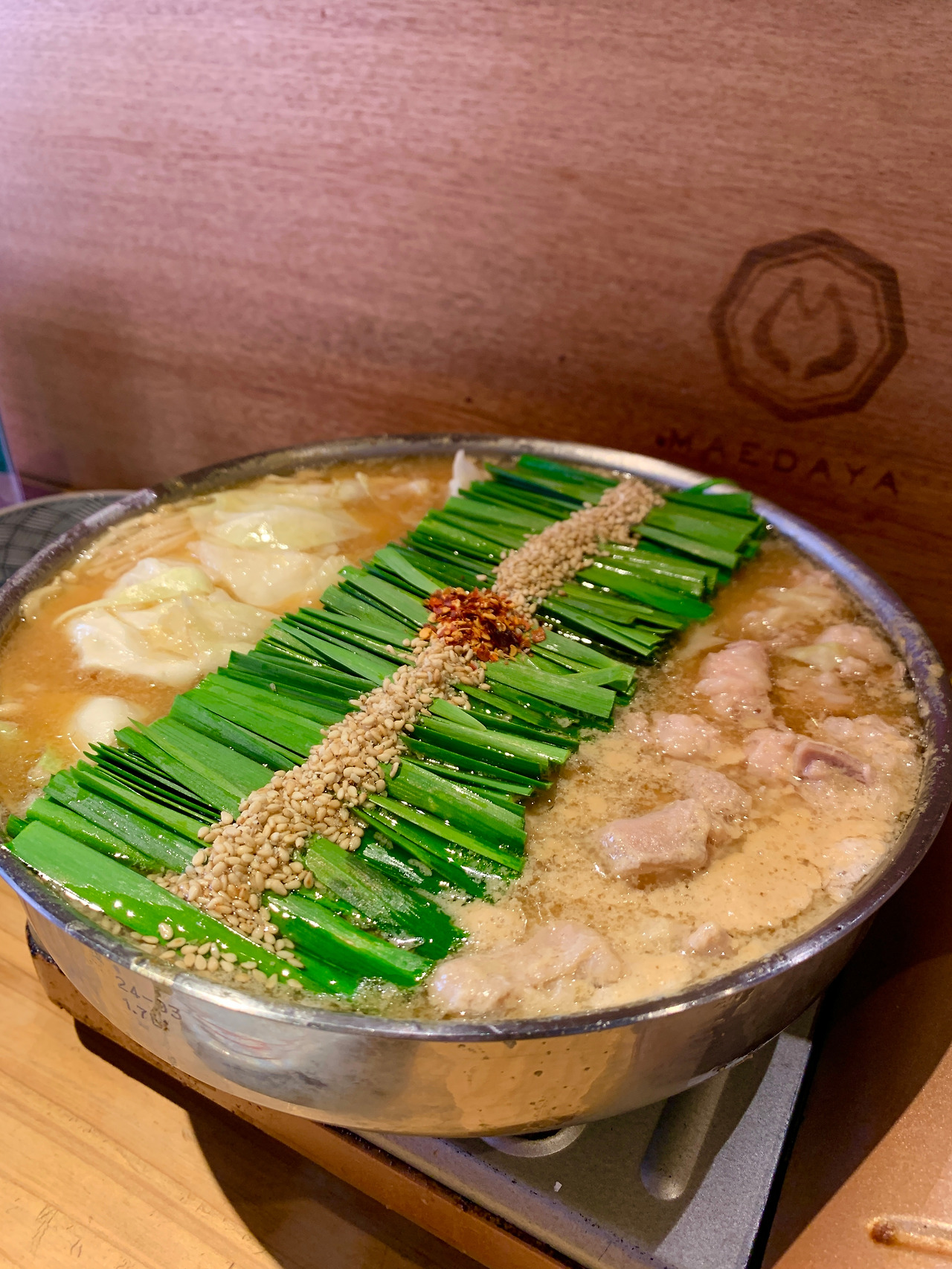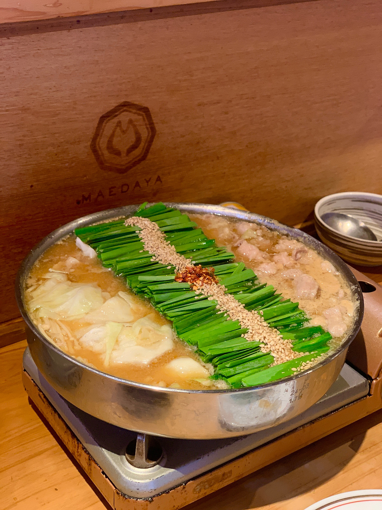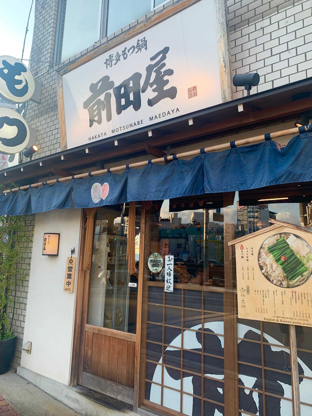 후쿠오카에 오면 꼭 먹어보라는 음식 중 하나가 모츠나베였다. 일본식 소 곱창전골이다. 사실 곱창을 그리 좋아하는 편이 아니지만 국물파인 남편을 따라 도전해 보기로 했다. 캐널시티에서 5분도 안 걸리는 곳에 있는 이곳은 마에다야 하카타점이다. 된장 베이스의 모츠나베랑 명란으로 유명한 식당이다. 이 더위에 기다리기 싫어서 오후 4시 50분쯤 도착했는데, 아니나 다를까 이미 줄이 길다. 저녁 영업 시작 시간이 오후 5시부터인데 말이다. 식당 직원이 기다리는 사람들에게 메뉴판을 먼저 준다. 메뉴판을 보다가 거리의 풍경을 바라보다가 사람 구경까지 하고 나니까 우리가 들어갈 시간이다. 한 20분 정도 기다렸다. 바 자리에 앉은 우리의 저녁 메뉴는 당연히 된장 베이스의 모츠나베, 명란을 소금에 절여 담근 젓갈인 멘타이코다.