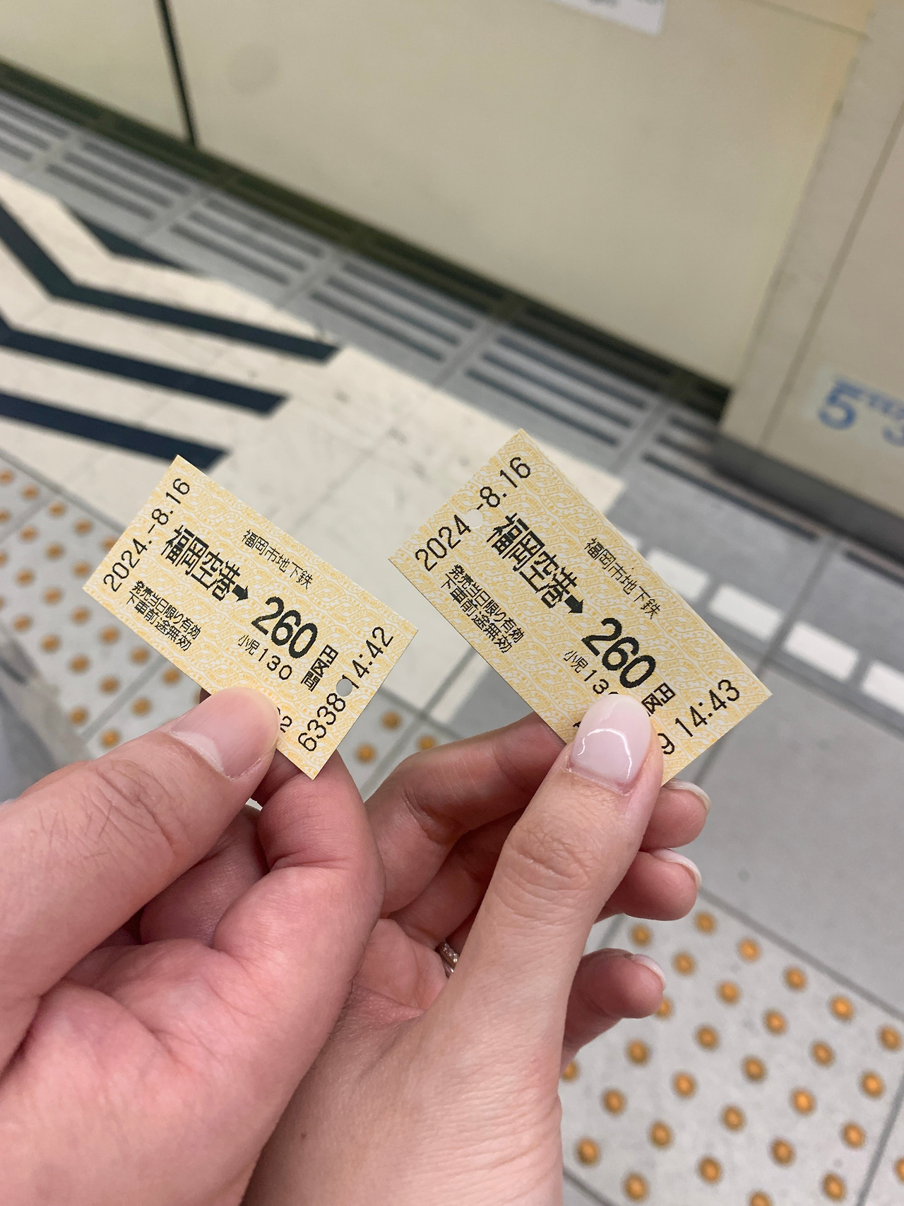 공항 셔틀버스를 타고 후쿠오카 공항역에 내렸다. 땀이 뻘뻘 나니까 얼른 지하로 내려가 전철표를 끊어보자. 일본 여행 3회 차이자 총무를 맡은 남편이 하카타역까지 가는 전철표를 끊었다. 예전 우리나라의 전철표랑 비슷하게 생겼다. 게이트에 쏙 넣으면 구멍이 뿅 뚫려서 나온다. 일본 여행이 처음인 나는 전철표 하나에도 감성을 느끼는 전형적인 MBTI F다.