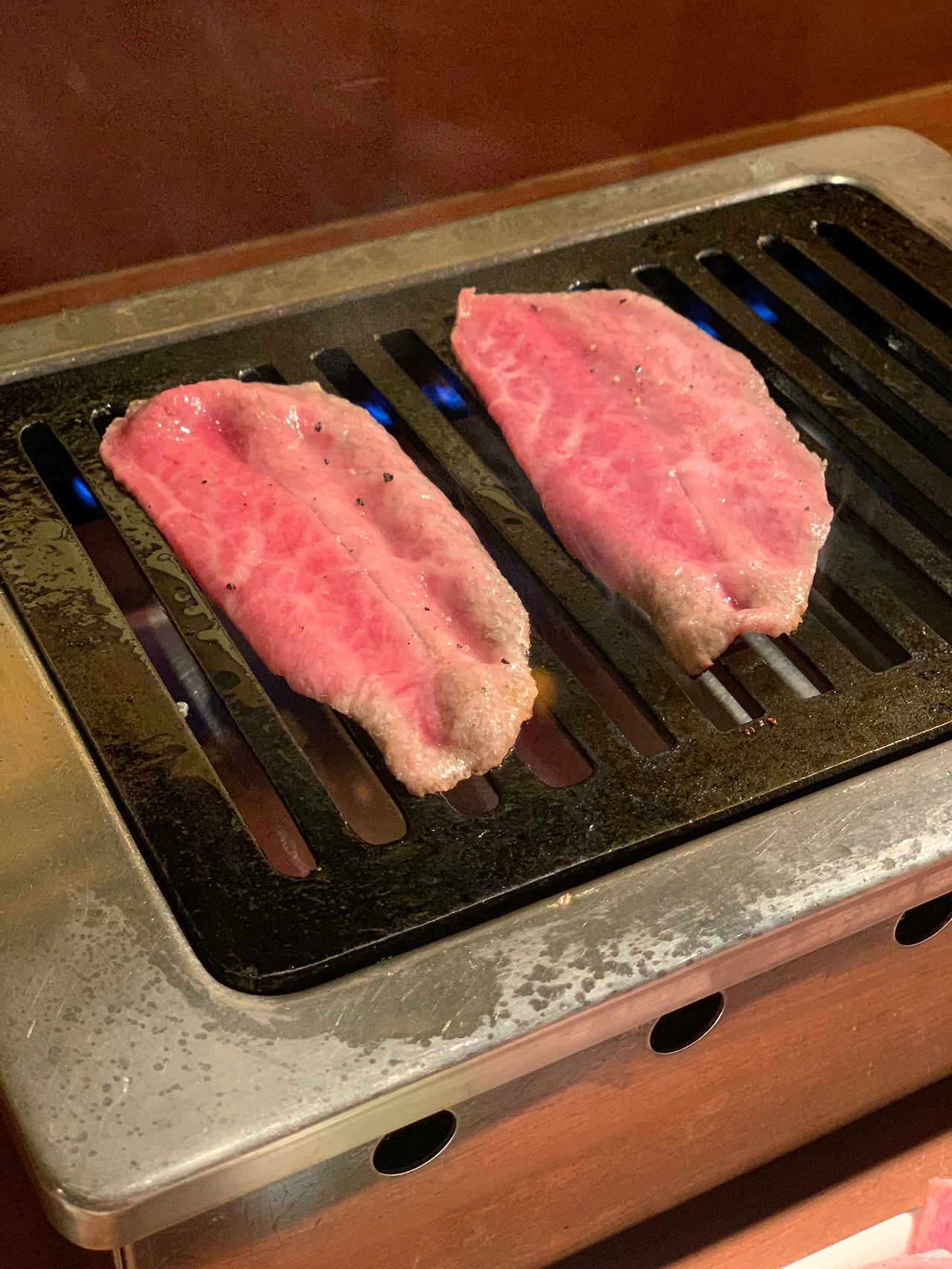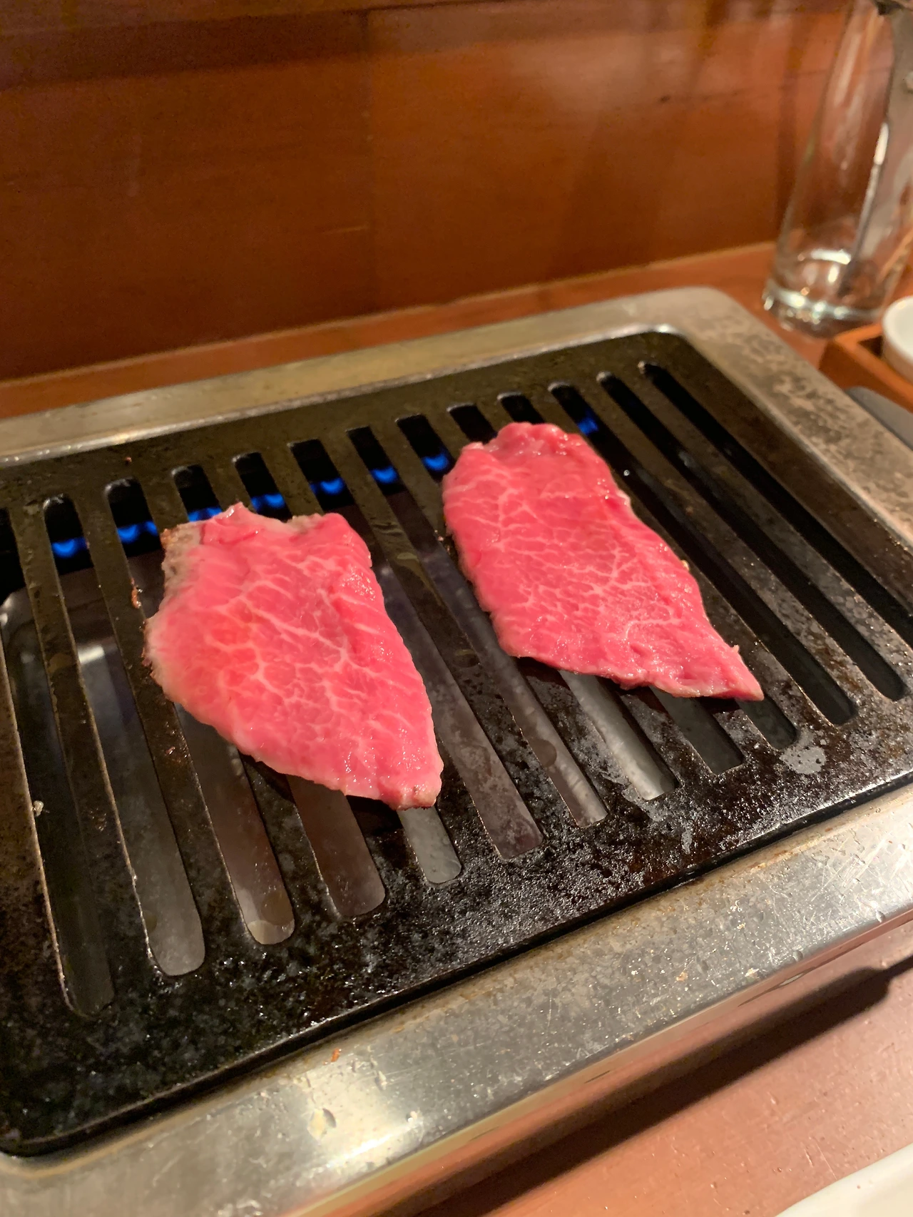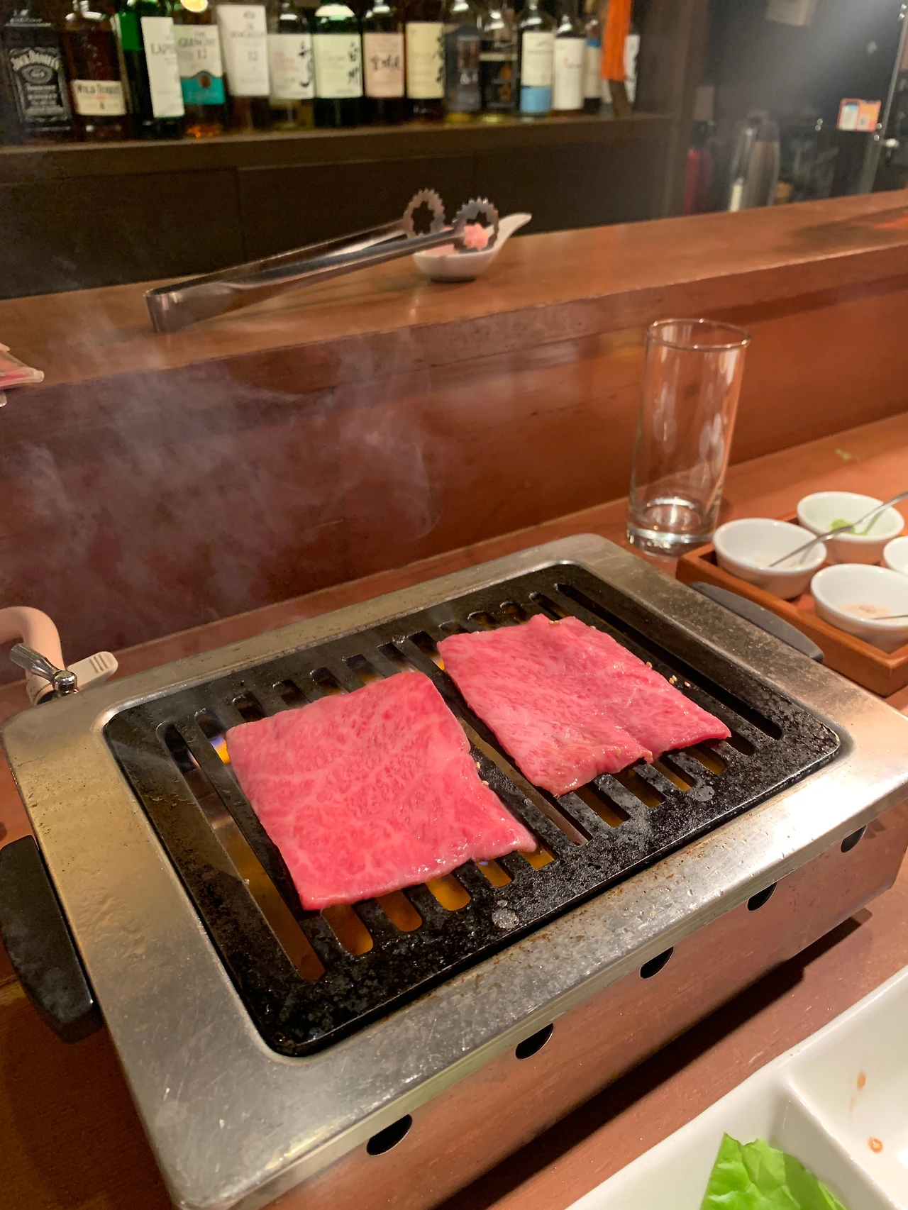 4가지 부위의 고기가 나왔다. 셰프님은 우리에게 이 4가지 부위가 소의 어느 부위인지 직접 몸짓으로 설명해 주셨다. 어찌나 쏙쏙 이해가 되던지 우리랑 직원들 모두 웃음이 터졌다. 역시 바디랭귀지는 어디에서나 통한다. 얼른 구워서 먹어보자. 첫 접시는 먹느라 바빠서 사진을 찍지 못했다. 다 먹고 나서 아차 싶었다. 이 맛있는 것을 남겨야 되는데 말이다. 어깨살, OO살, OO살, OO살이라고 들은 것도 지금은 기억이 나지 않는다. 혀에서 살살 녹았던 맛만 기억이 난다. 한점 한점 올려서 10초만 살짝 익히면 이렇게 맛이 좋을 수 없다. 절로 박수가 나왔다. 우리의 맛깔난 리액션에 셰프님과 직원분들의 뿌듯한 표정이 보였다.