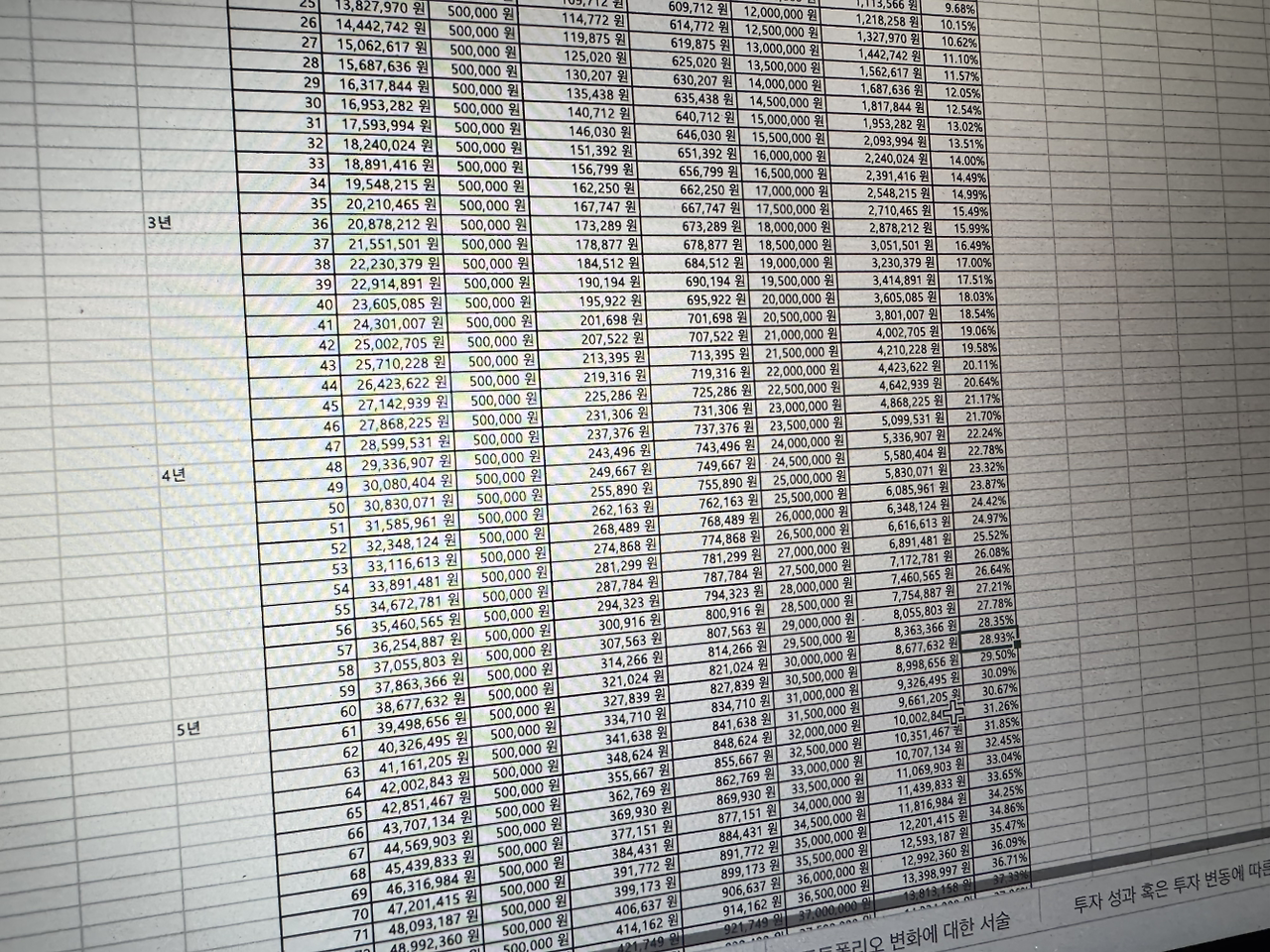 매달 300만 원 정도의 수입을 투자하고 있다. 앞으로도 지속할 계획이다. 하지만 엑셀표에 수식을 넣고 앞으로의 5년을 쭉 계산했을 때, 그리 낭만적인 결과는 나오지 않는다. 복리의 효과를 최대로 계산하여 1년 10%의 수익으로 생각하더라도 30%에 미치지 않는다.