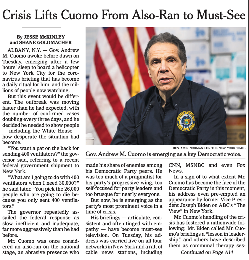 "What am I going to do with 400 ventilators when I need 30,000?" he said later. "You pick the 26,000 people who are going to die because you only sent 400 ventilators."