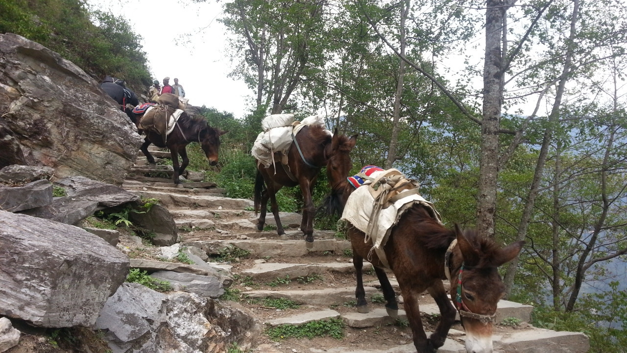 거짓말 같이 맑은 날씨. 멀리 설산이 보였다. 해발 3000M 이상부터는 고산증에 대비해야 해서 트레킹 초반 이틀은 이동거리를 길게 잡았다. 로지 비용을 지불하고 출발했다. 숨이 찰 때쯤 등 뒤에서 딸랑거리는 방울소리가 들렸고 등짐을 지고 산을 오르는 당나귀 떼를 볼 수 있었다. 1000M 고도를 내리고 올라 촘롱에 도착했다. 이른 점심을 먹고, 건너편 산자락에 보이는 시누아를 바라보았다.