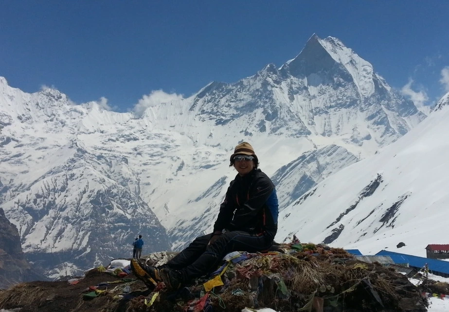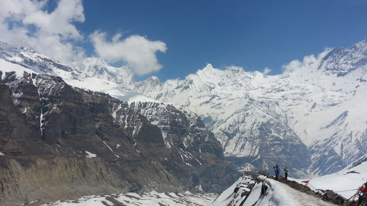 아침에 일어나니 얼굴이 심하게 부어있었다. 고산 증상 중 하나라고 했다. 다행히 어지러움증이나 구토 증상은 없었다. 오늘은 마차푸레나 베이스캠프(MBC)에 숙소를 잡고, 안나푸르나 베이스캠프(ABC)에 가서 점심을 먹는 일정이었다. 지난밤에 로지 앞에 눈사태가 났었고, 계곡을 지날 때 특히 위험하다고 하여 풍경을 감상할 틈도 없이 열심히 걸었다. 그렇게 3시간을 걸어 MBC에 도착했다. 사방의 설산들이 병풍처럼 둘러져 있는 곳이었다. 설산 정상에서는 설연이 피어오르고, 맑은 날씨 덕에 파란 하늘이 대조되어 더욱 아름다웠다. 4일간의 고생이 머릿속에서 순식간에 사라졌다. MBC에 숙소를 잡고 한시간 정도 눈길을 걸어 ABC로 갔다. 고개를 들어 하늘을 보았다. 공기층이 얇아서 인지 30년간 내가 봐 오던 하늘색이 아니었다. 지금도 눈을 감고 상상하면 그 선명한 파란색에 가슴이 떨리고, 눈앞이 아찔해지는 듯하다. MBC에서 잘 보이지 않던 마차 푸레나의 전체 모습도 볼 수 있었다. 세계 3대 미봉이라는 이름이 아깝지 않았다. ABC에 조금 더 올라가면 산악인 박영석 대장의 묘비가 있다. 안나푸르나에 코리안 루트를 만들기 위해 등정하던 중 눈사태에 휩쓸려 다른 대원 두 분과 함께 돌아가셨다고 했다. 세분의 묘비 앞에서 누군가는 슬퍼했고, 누군가는 아쉬워했다.